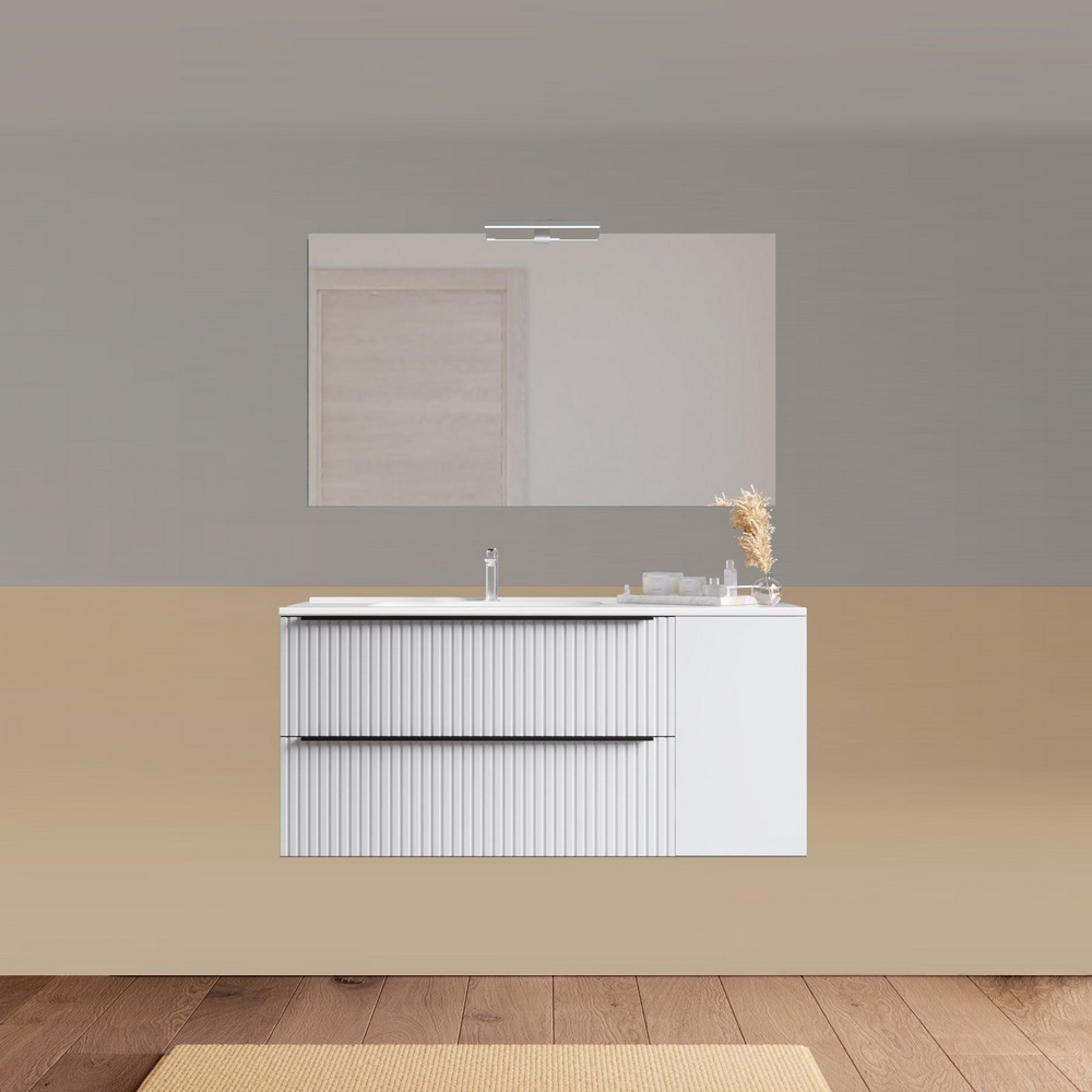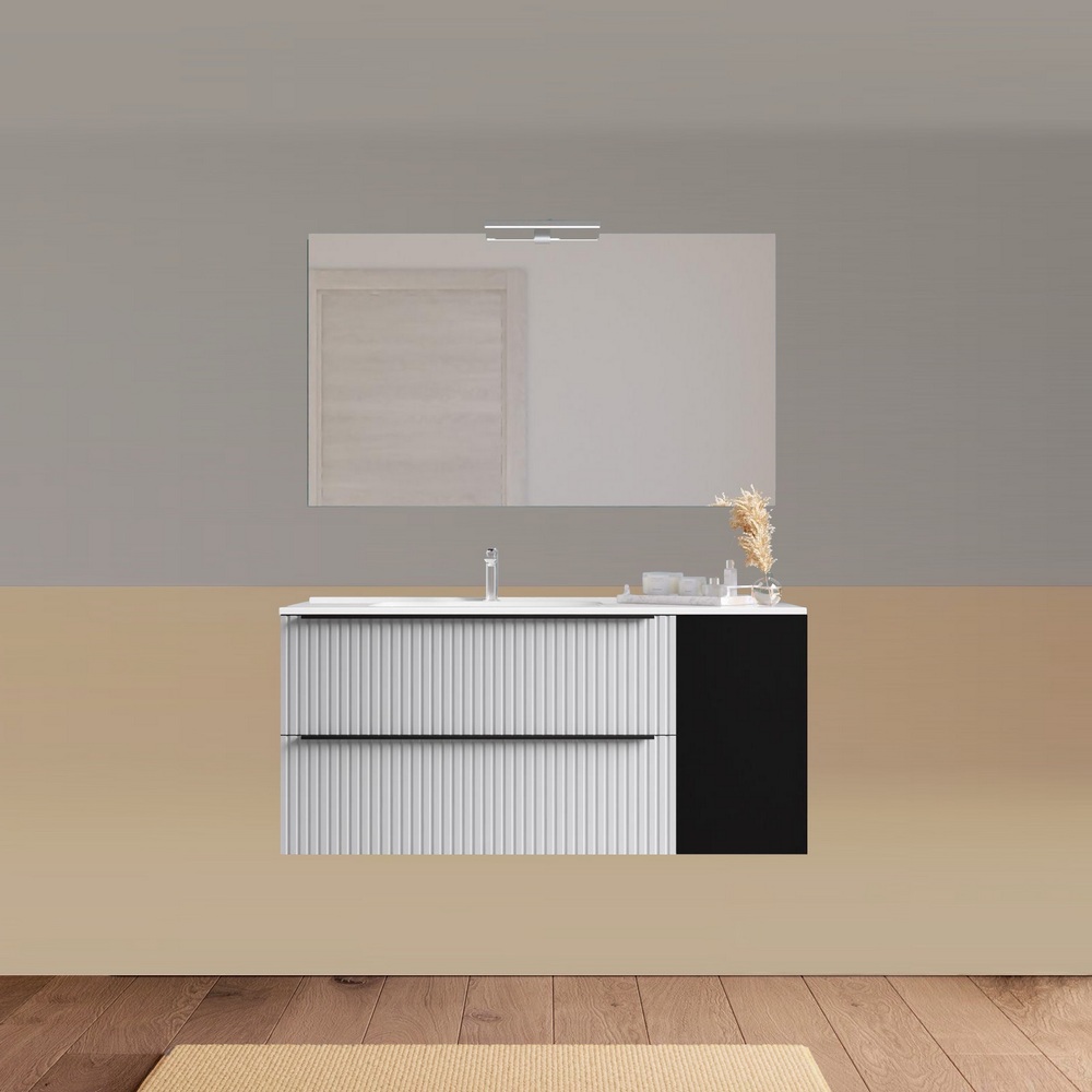 Arredo bagno sospeso in diverse misure e colori. Il mobile è composto da due cassetti con frontali ad effetto cannettato e un anta satinata. Il lavabo ha la vasca decentrata a destra o a sinistra.