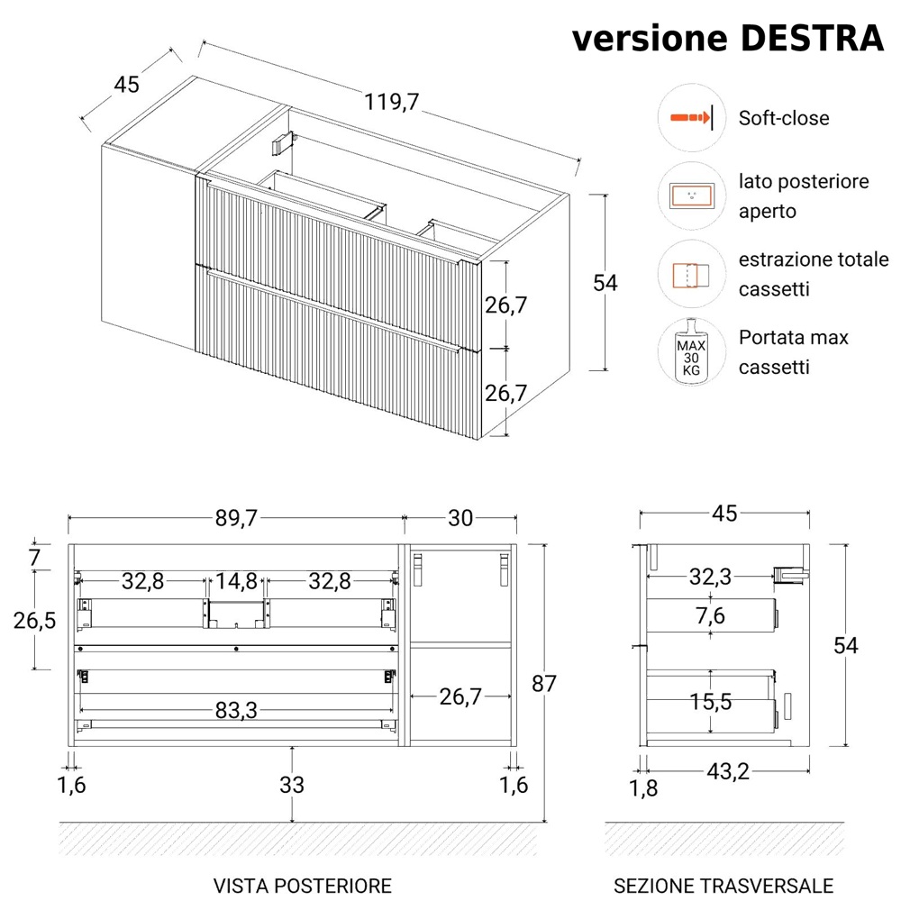 Arredo bagno sospeso da 120xP45xH54 cm con due cassetti ed un anta