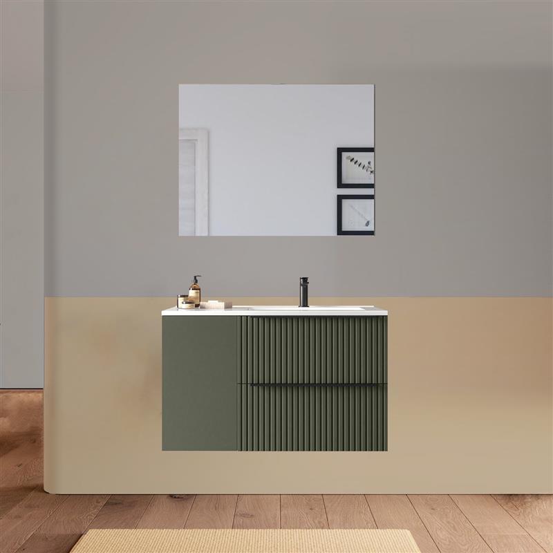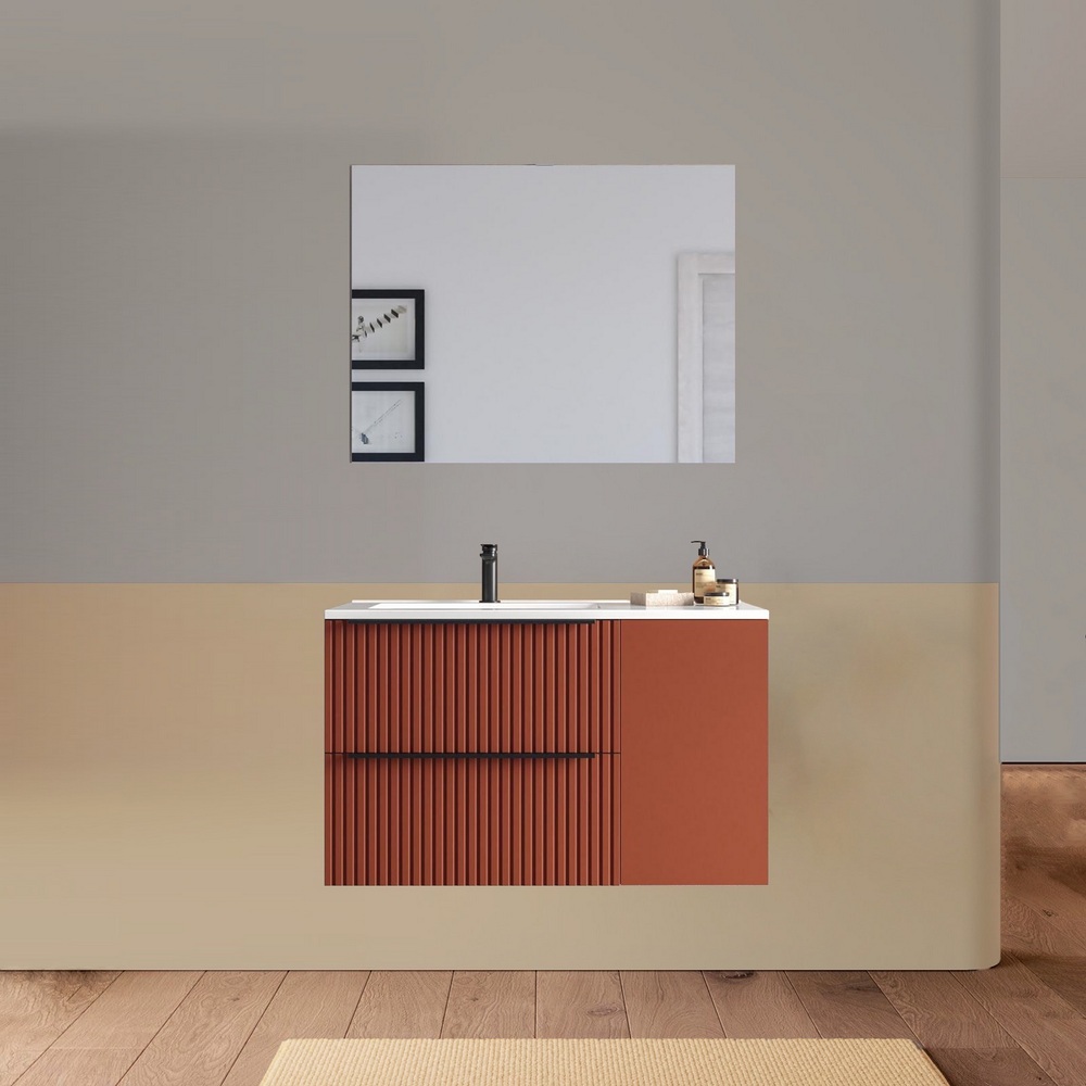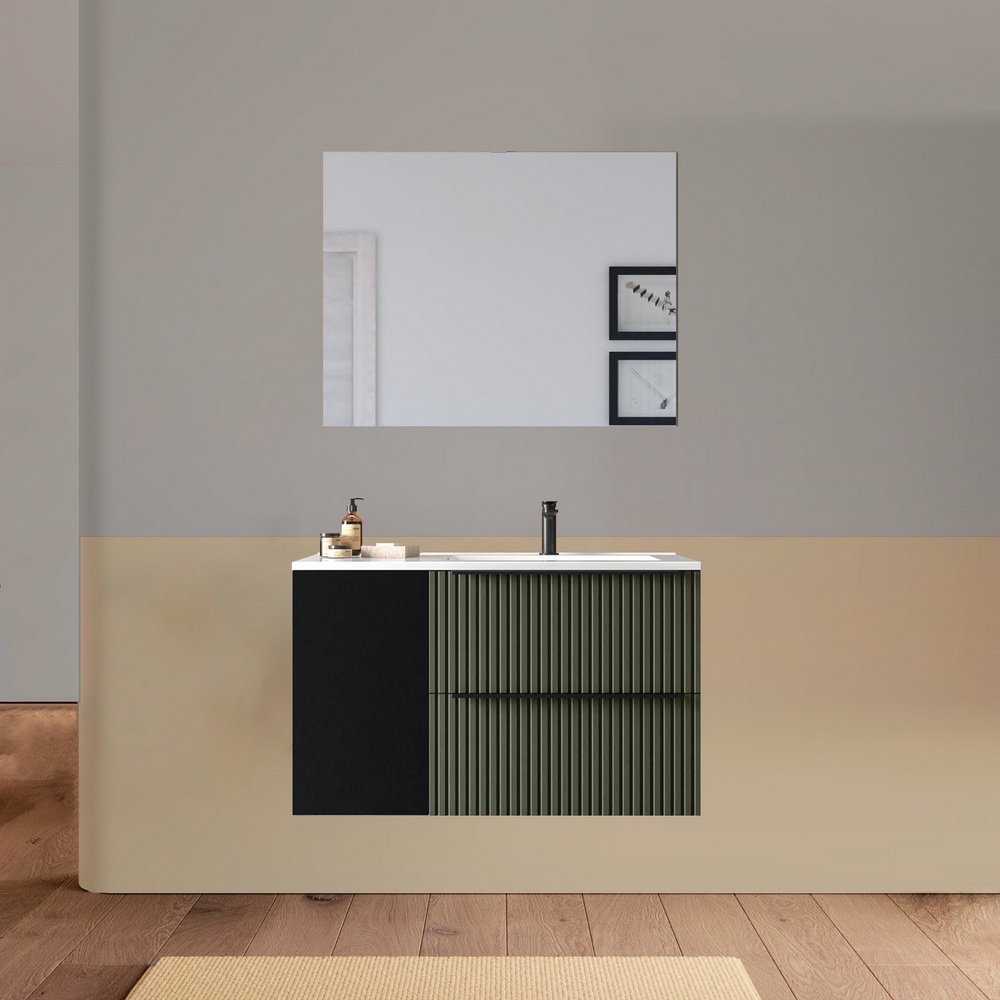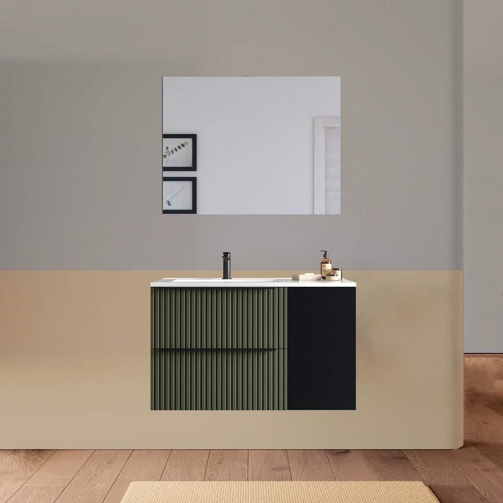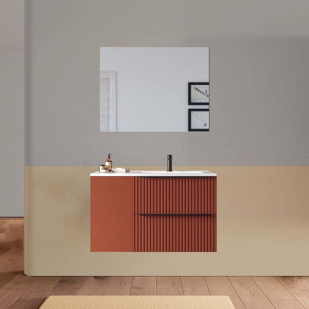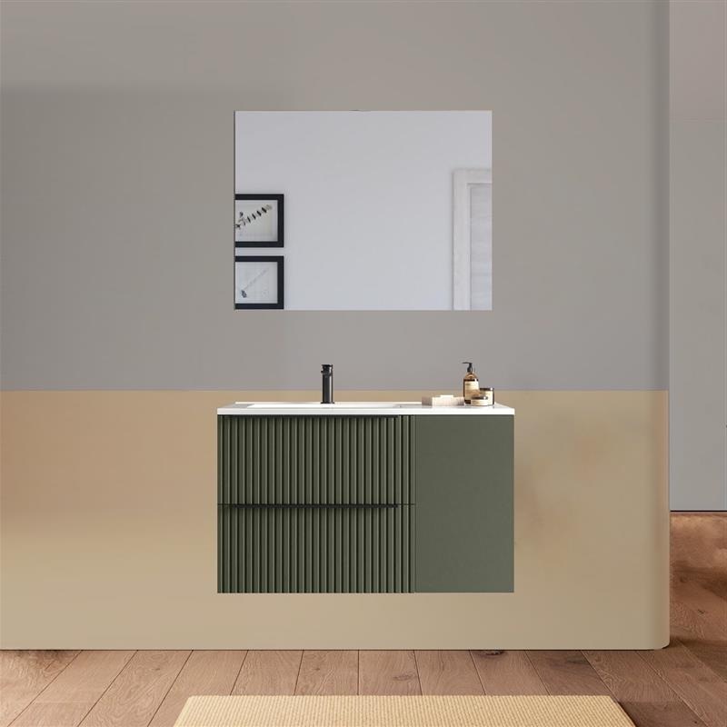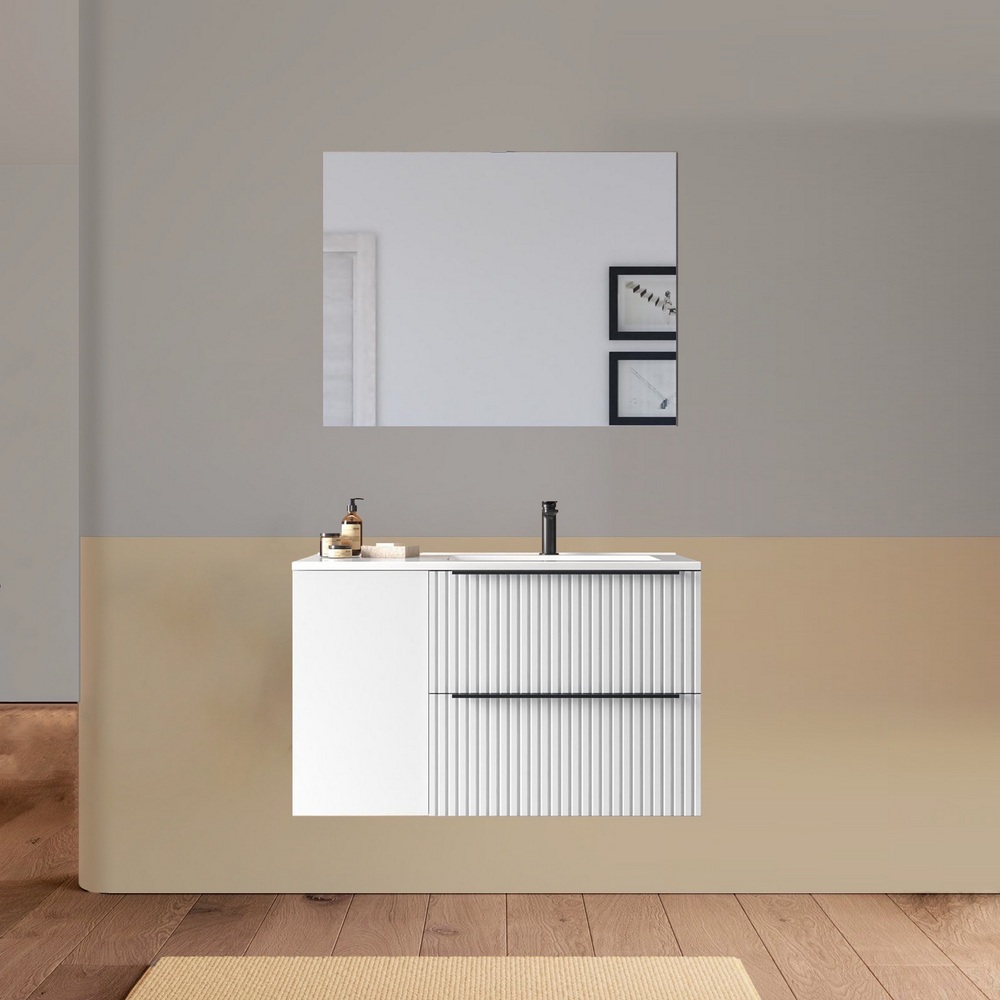Arredo bagno sospeso da 90 o 100 cm disponibile in diversi colori. Il lavabo in ceramica ha una versione dx e una sx e la base è composta da due cassetti e un’anta. Lo specchio è incluso.