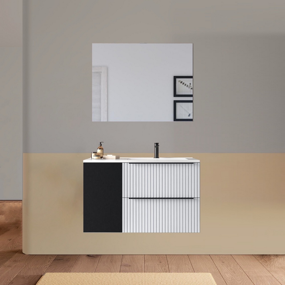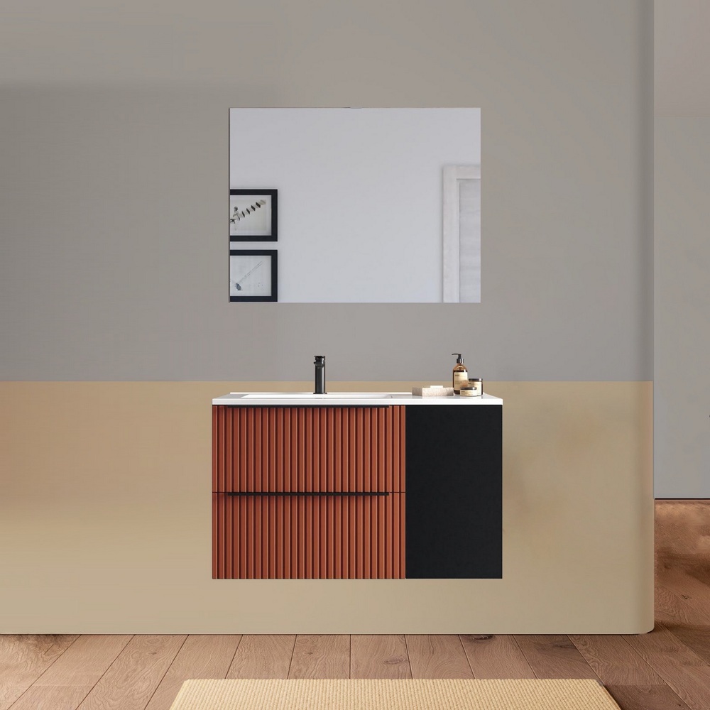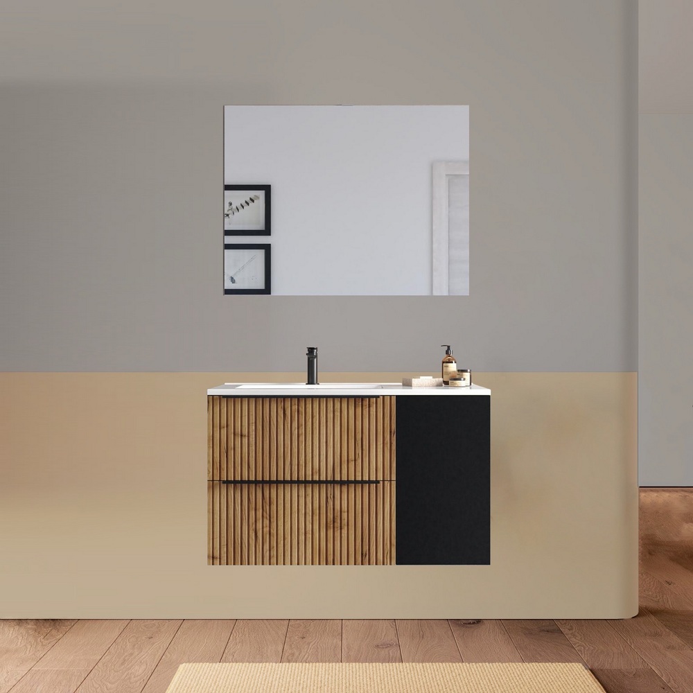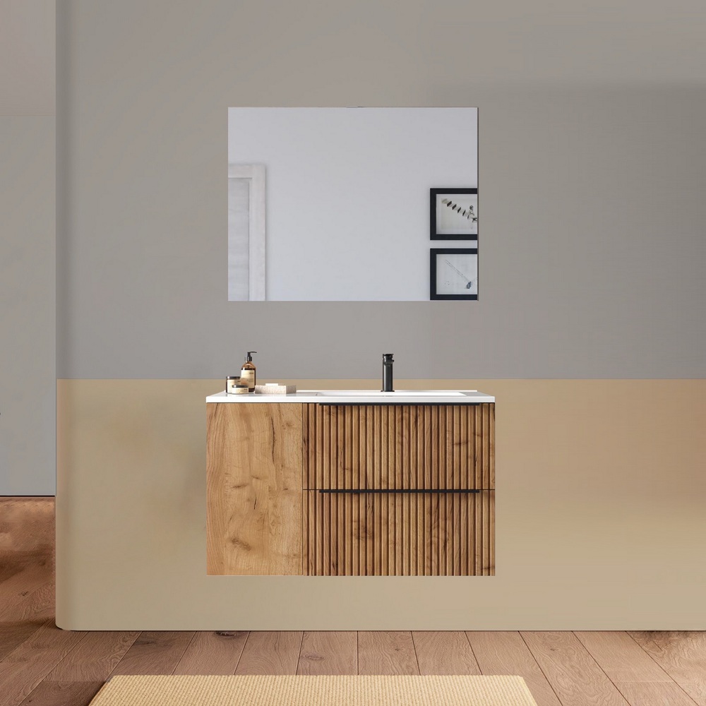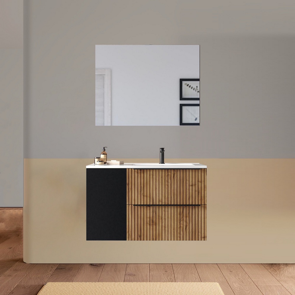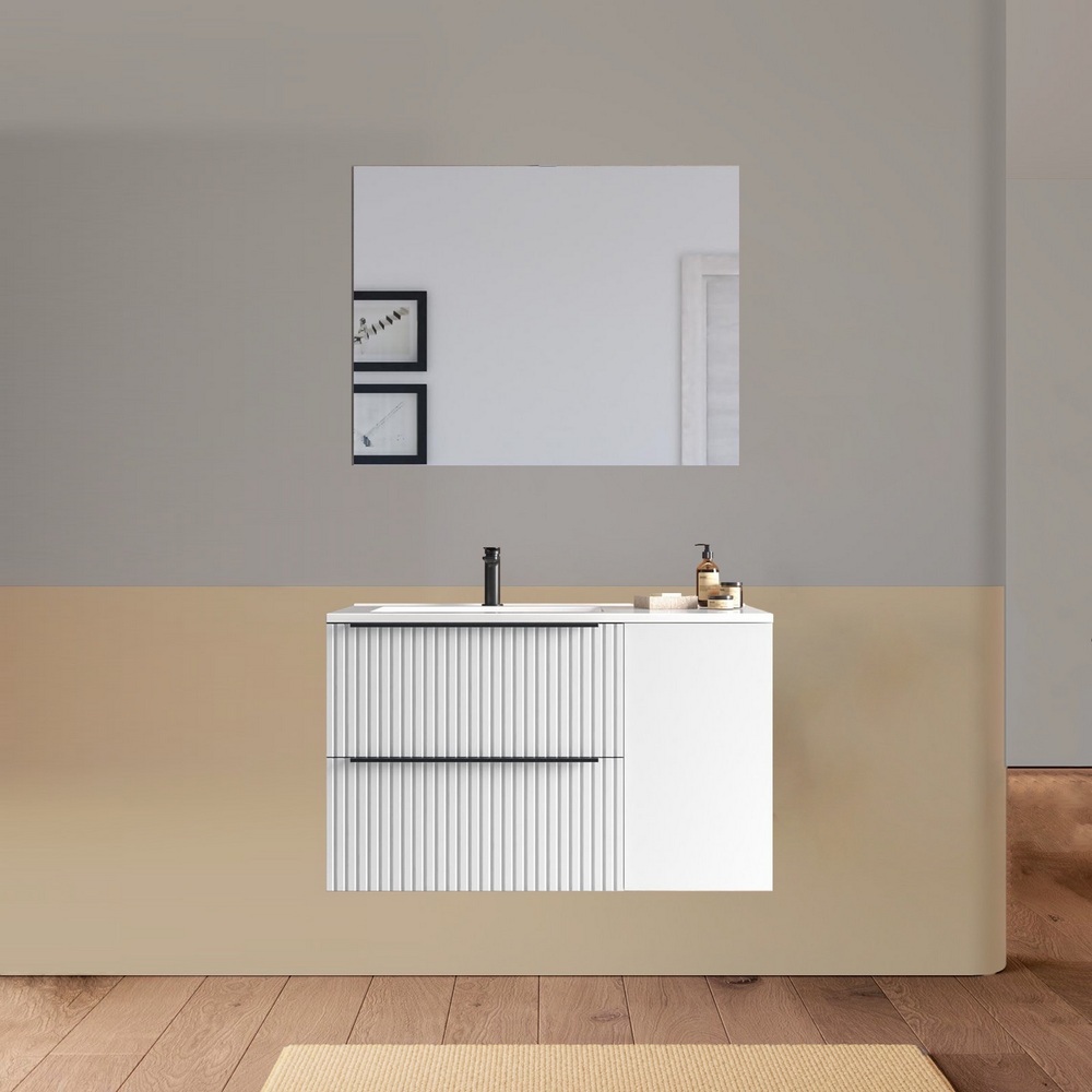Arredo bagno sospeso da 90 o 100 cm disponibile in diversi colori. Il lavabo in ceramica ha una versione dx e una sx e la base è composta da due cassetti e un’anta. Lo specchio è incluso.