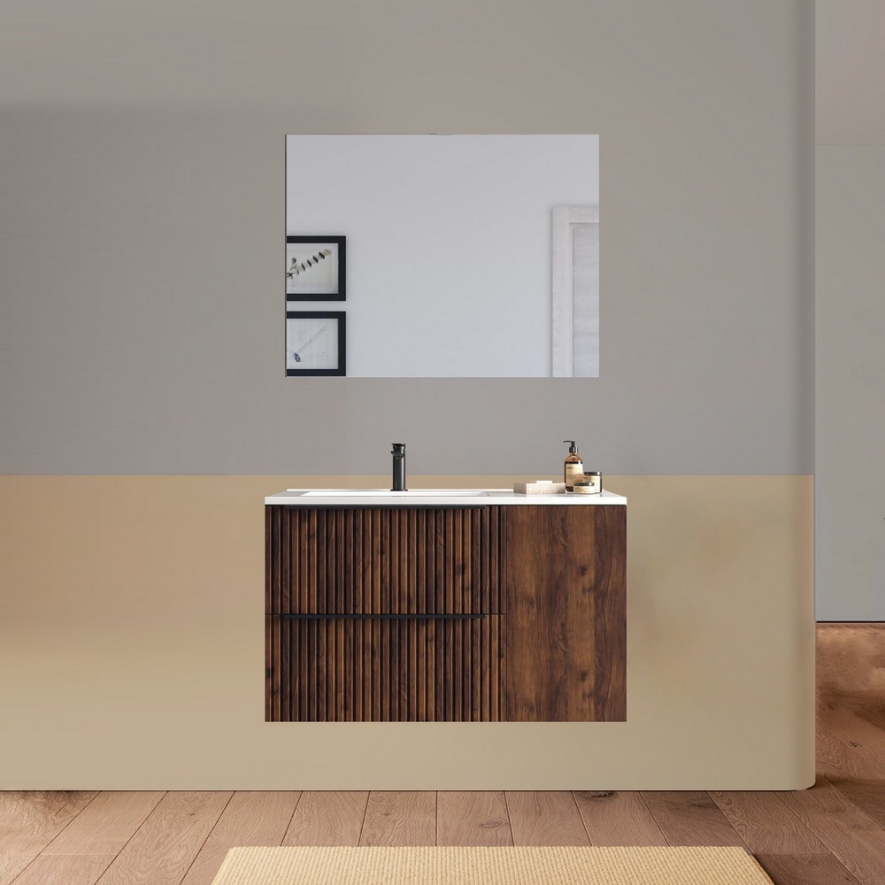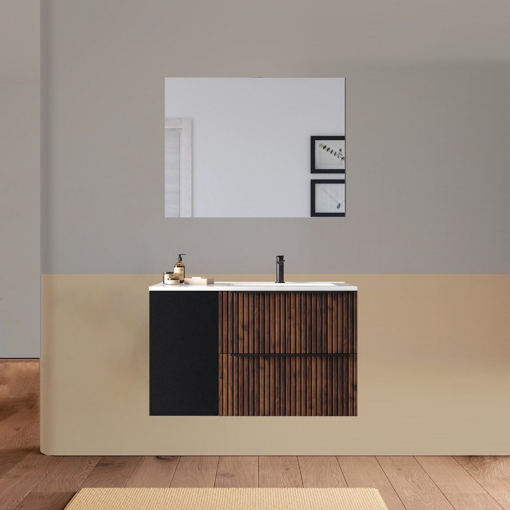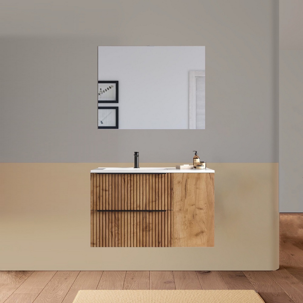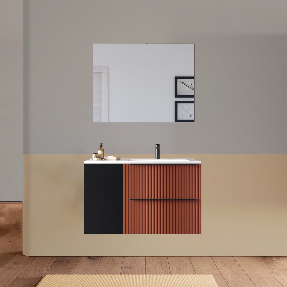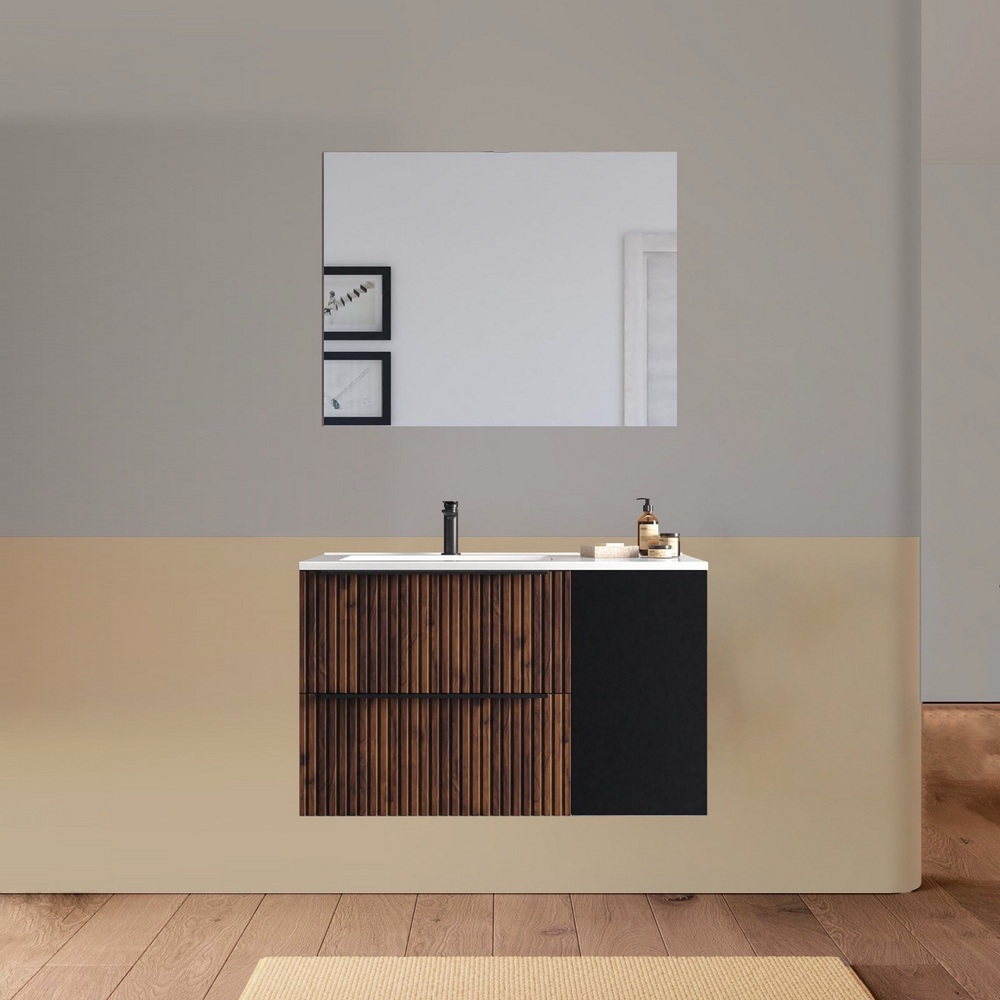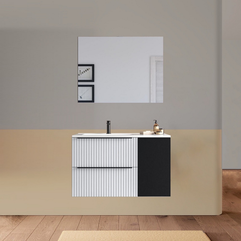Arredo bagno sospeso da 90 o 100 cm disponibile in diversi colori. Il lavabo in ceramica ha una versione dx e una sx e la base è composta da due cassetti e un’anta. Lo specchio è incluso.