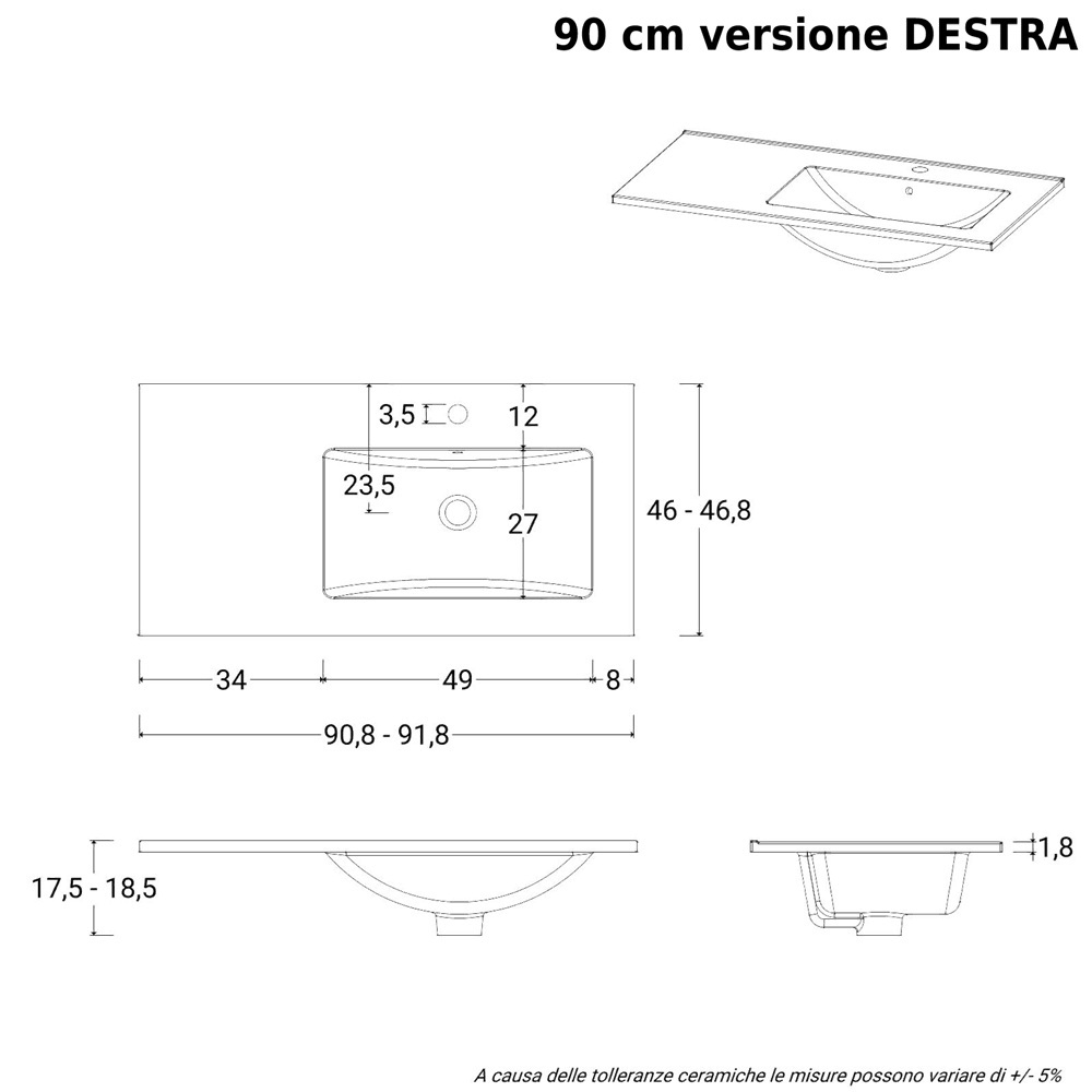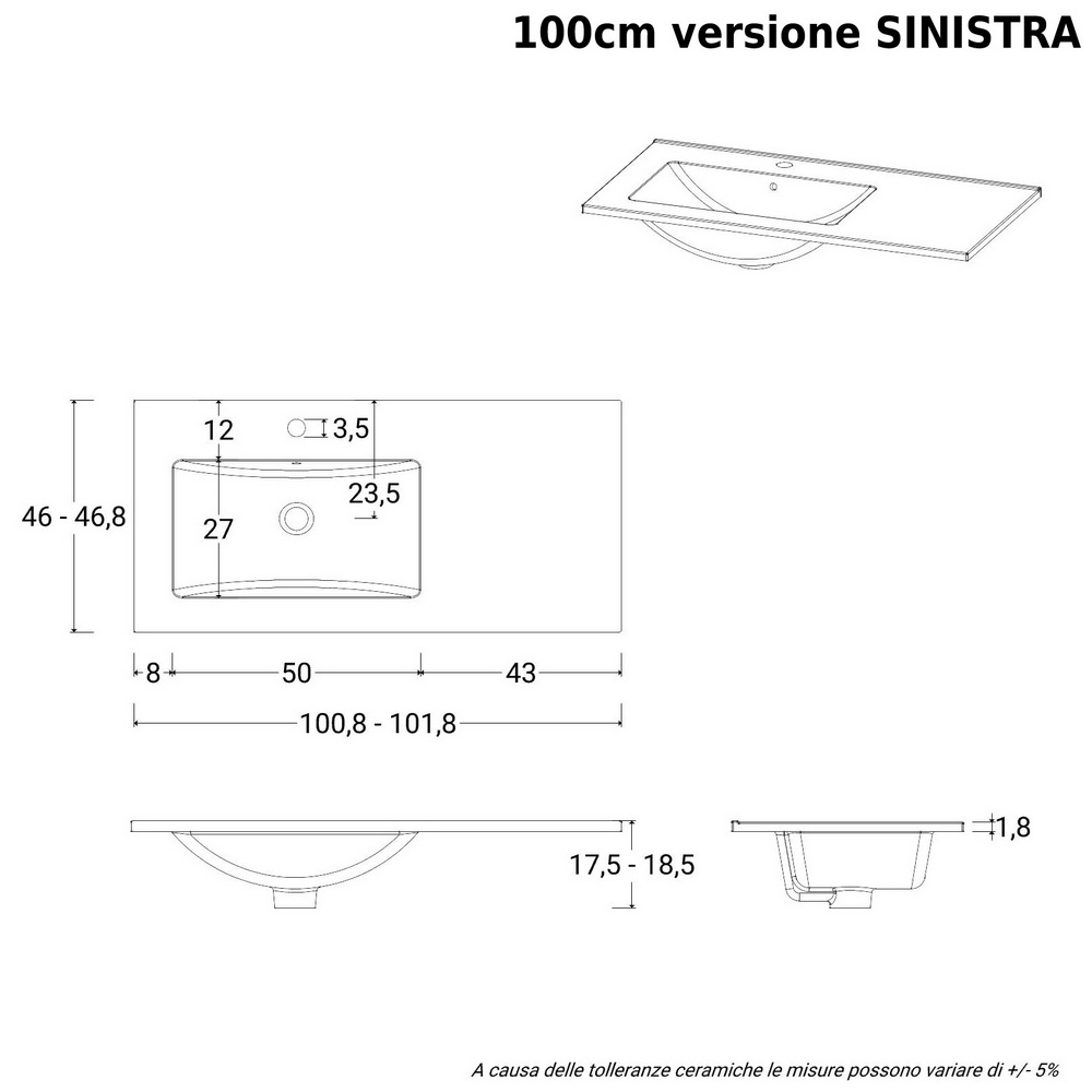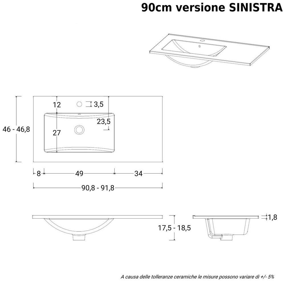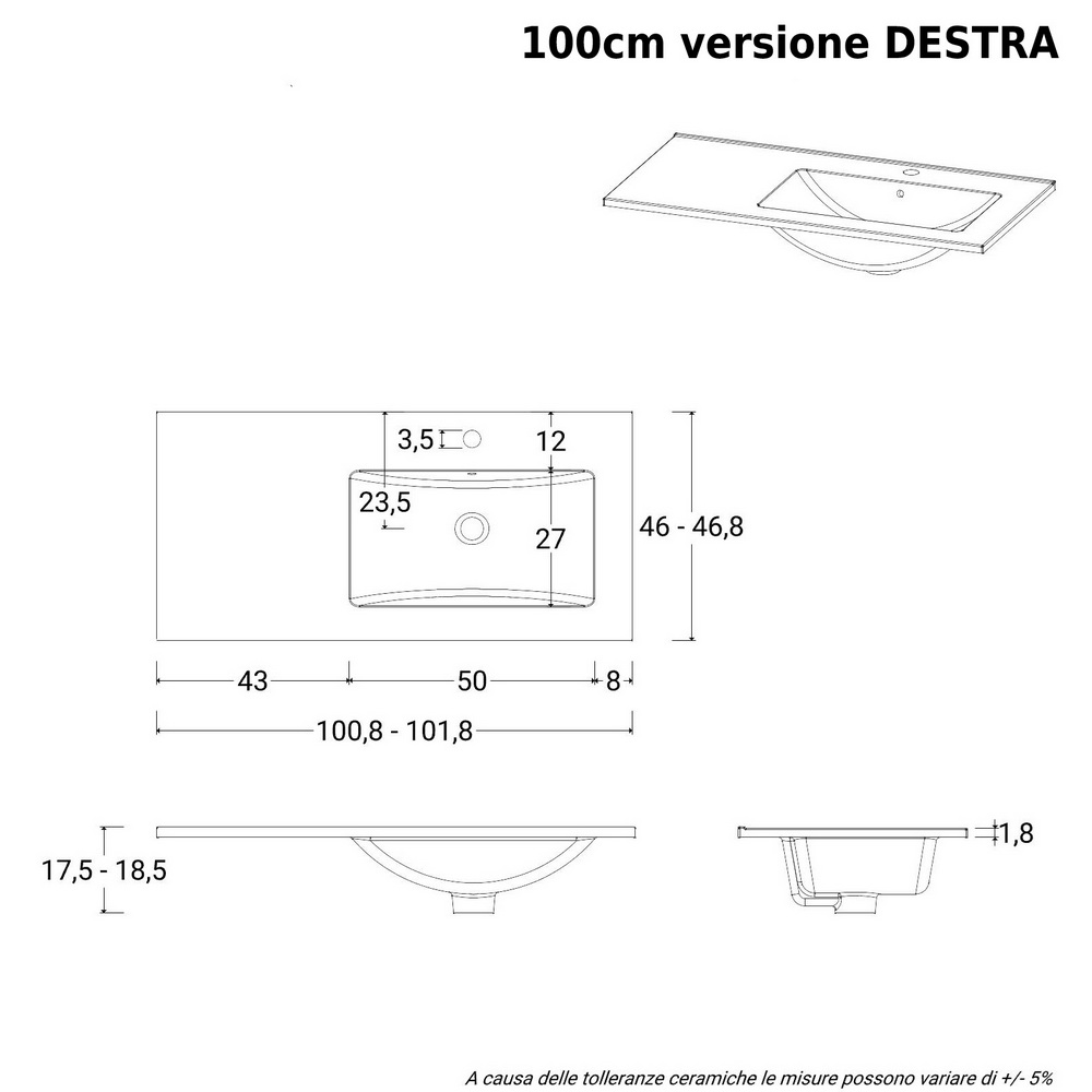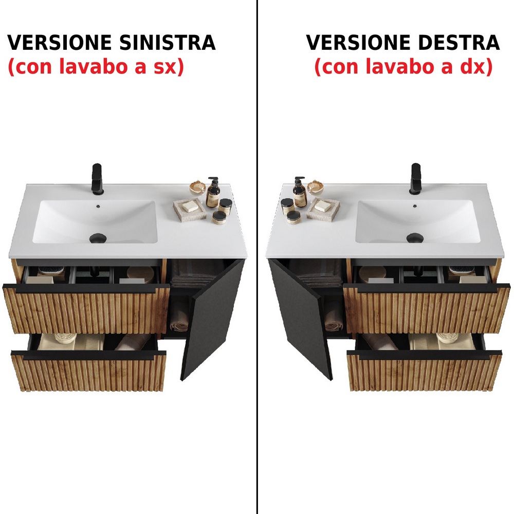 Il lavabo è realizzato in ceramica bianco lucido ed è disponibile nella versione decentrata A DESTRA oppure A SINISTRA (sopra i cassetti)