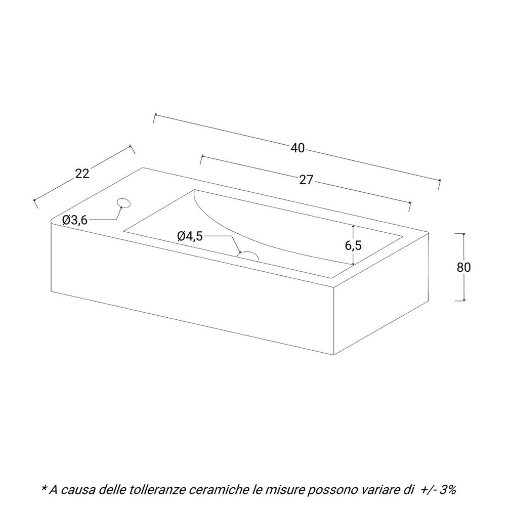 Lavabo bianco lucido in ceramica, con foro troppopieno e foro per rubinetto (rubinetto NON incluso nell’offerta), le misure interne sono 27xP20xH6,5 cm