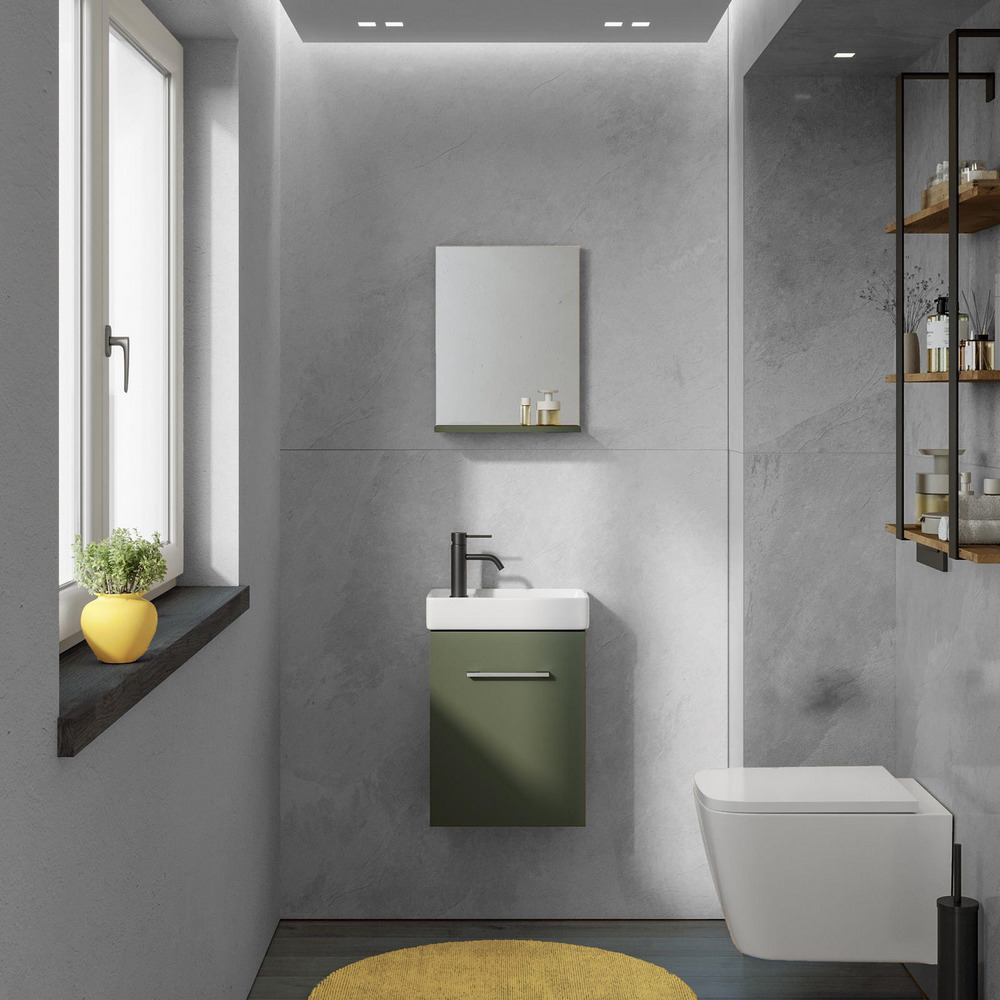 Arredo bagno sospeso disponibile nei colori rovere bianco, rovere sabbia e verde street. Lo specchio è incluso nel prezzo.