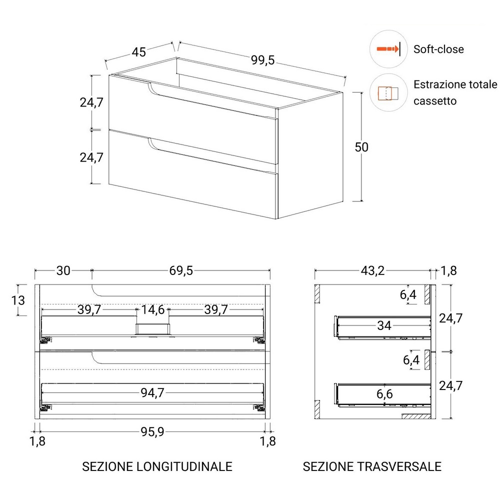 - da 100x45xH50 cm (con specchiera da 70×100 cm)