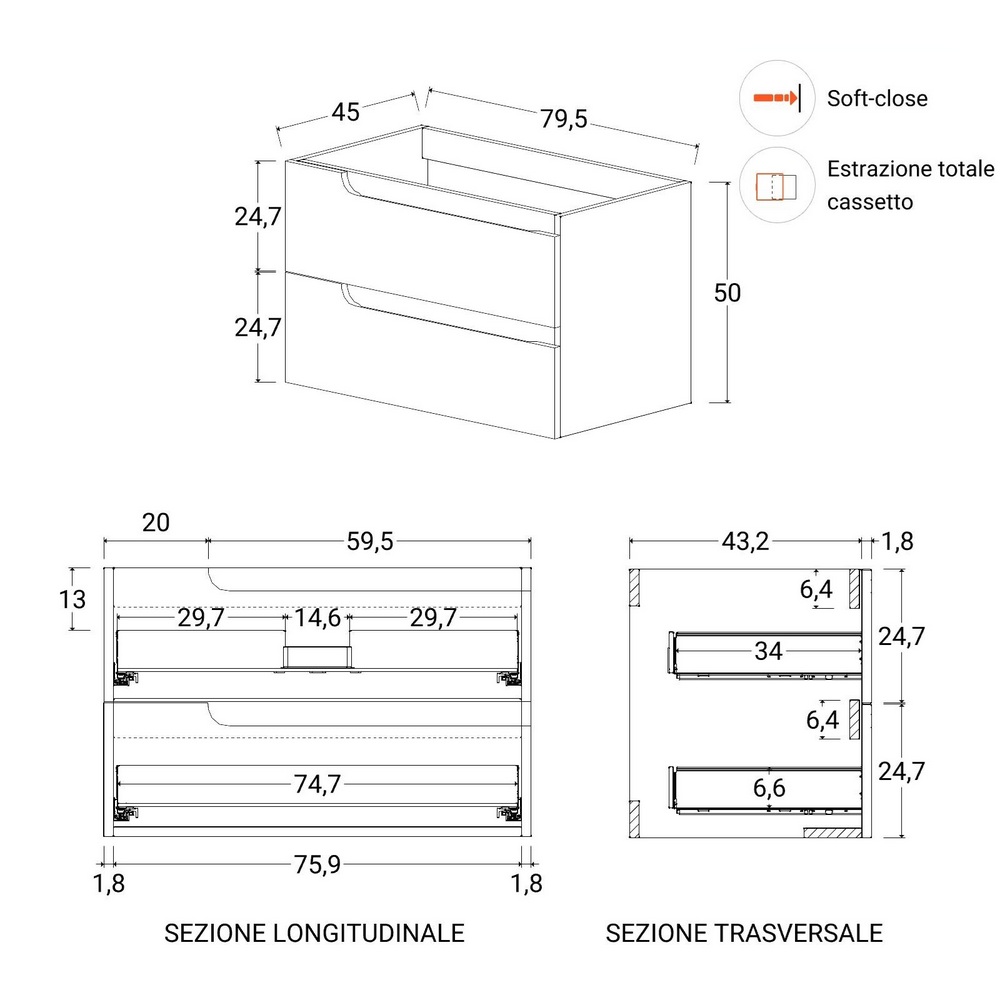 - da 80x45xH50 cm (con specchiera da 70×90 cm)