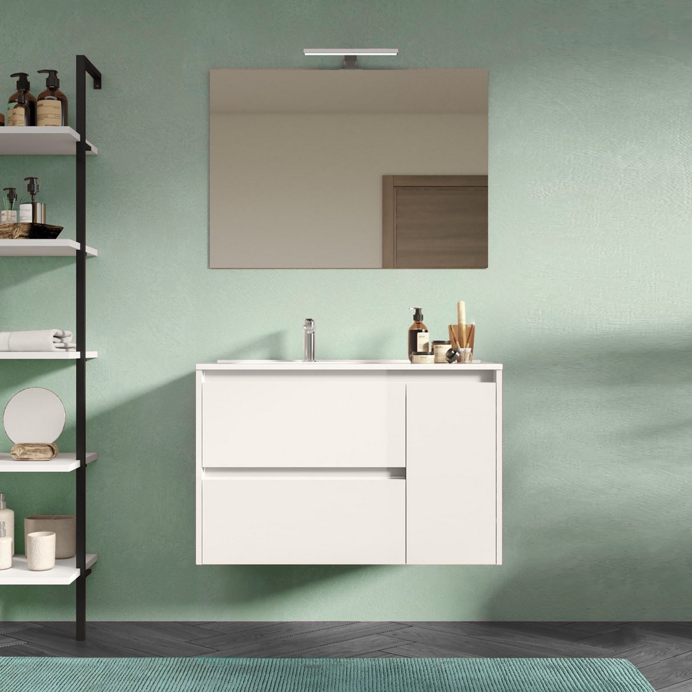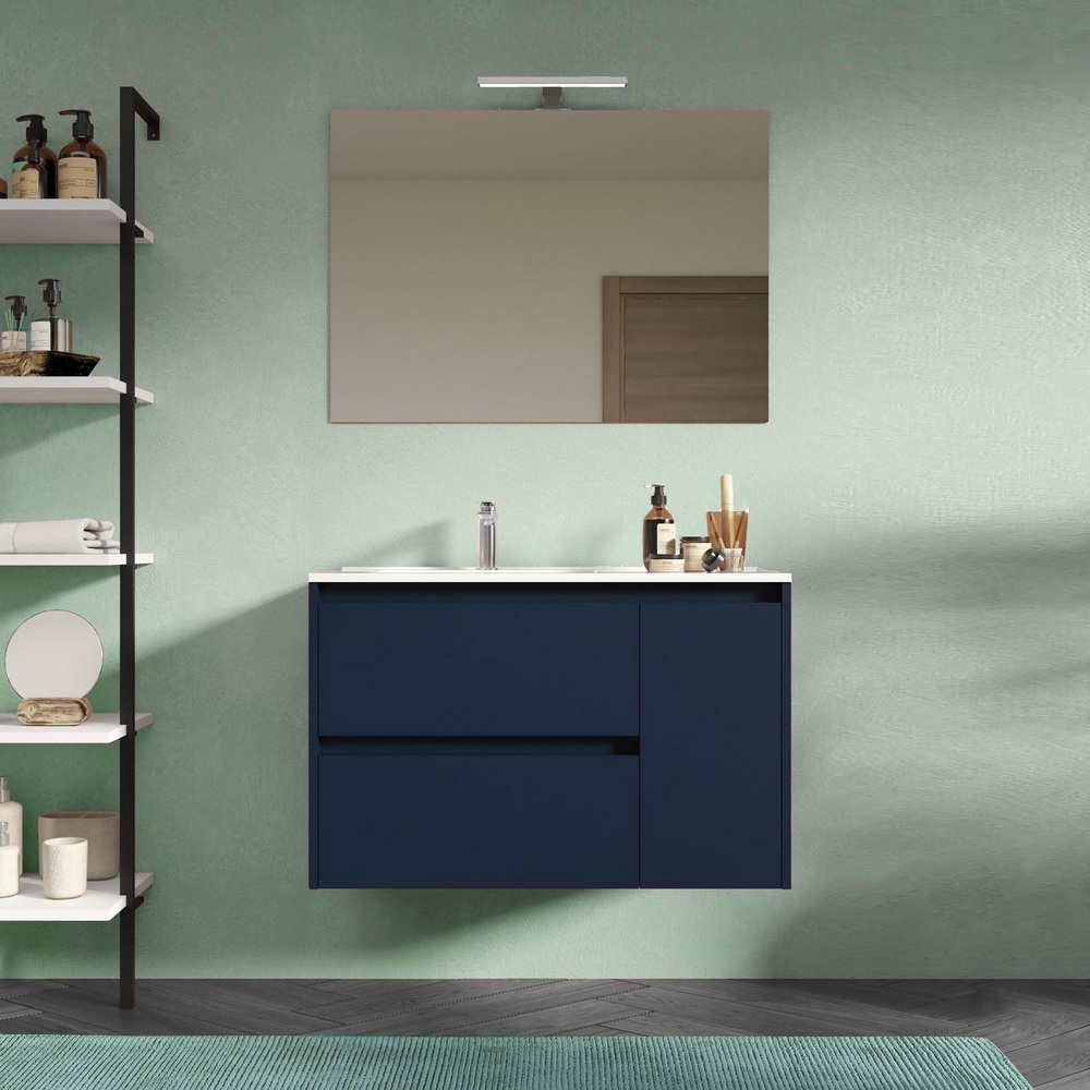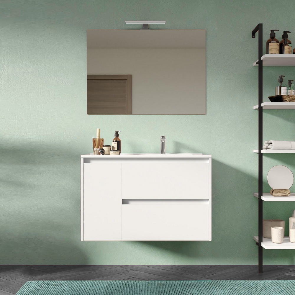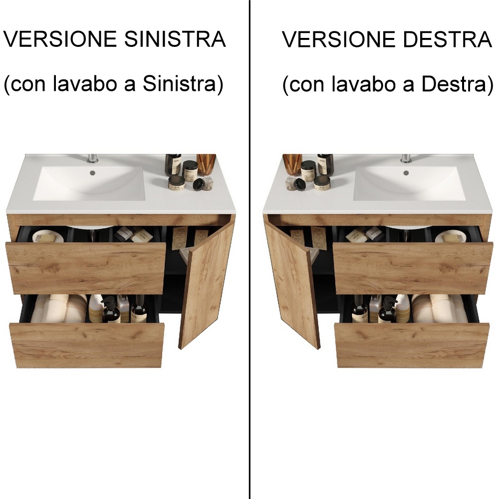 – mobile da 85 cm, 2 cassetti + 1 anta, (lavandino decentrato sulla destra o sulla sinistra) con specchiera 70×90 cm