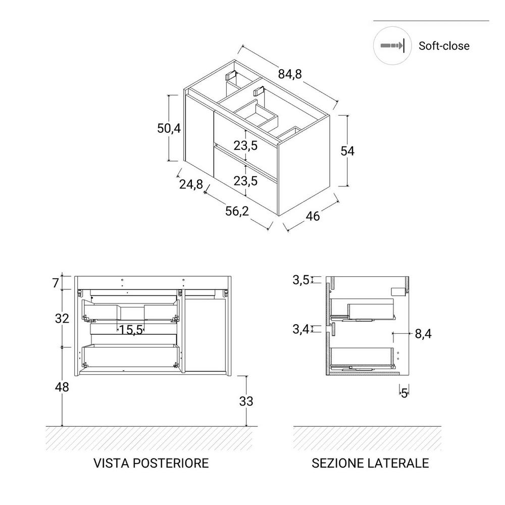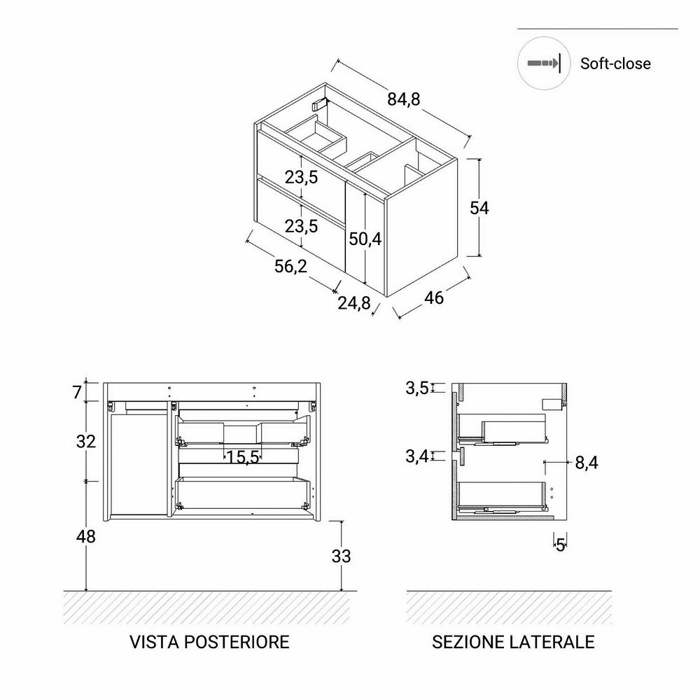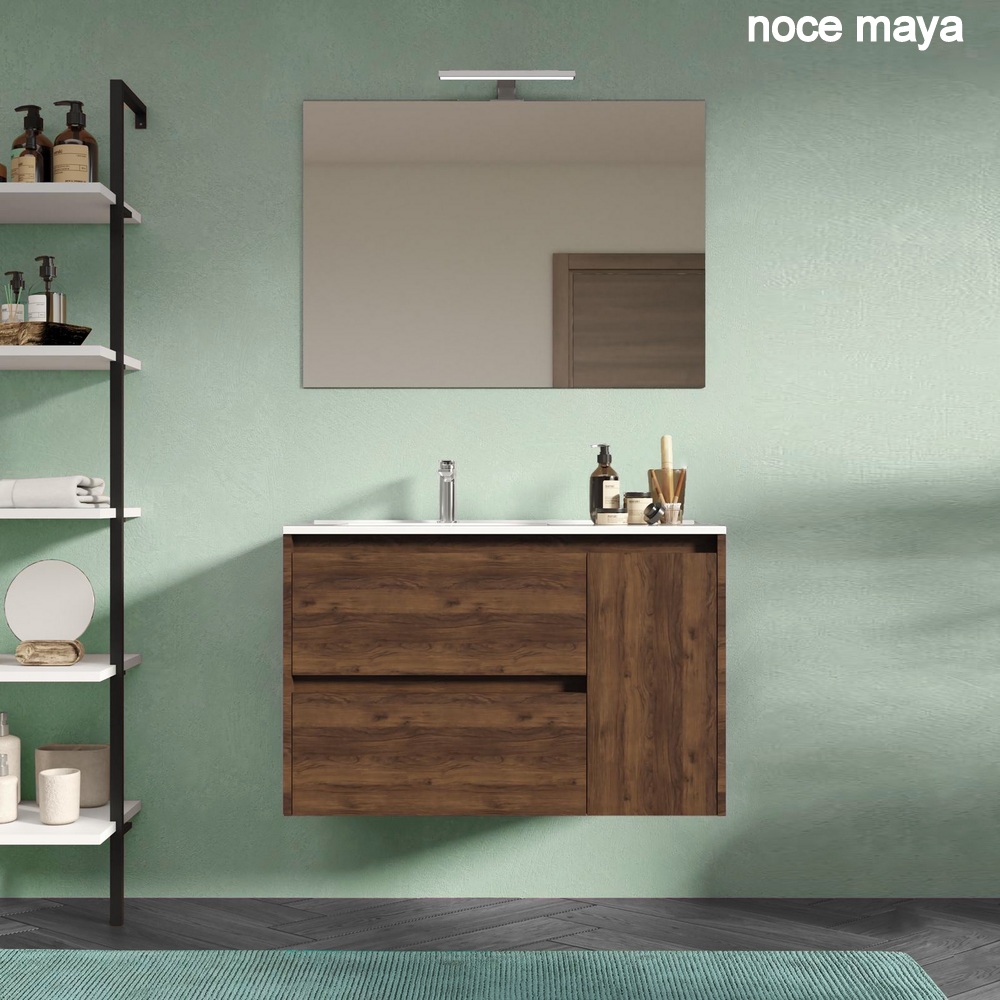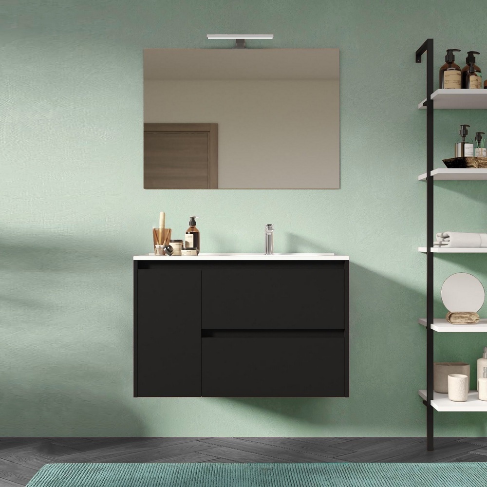 – mobile da 85 cm, 2 cassetti + 1 anta, (lavandino decentrato sulla destra o sulla sinistra) con specchiera 70×90 cm
