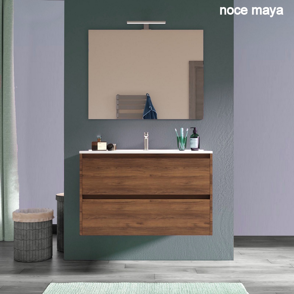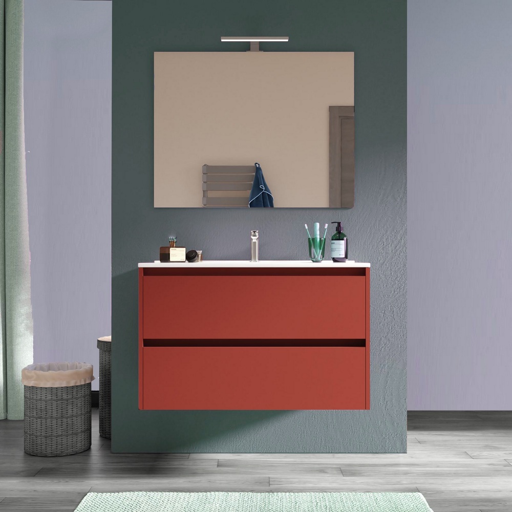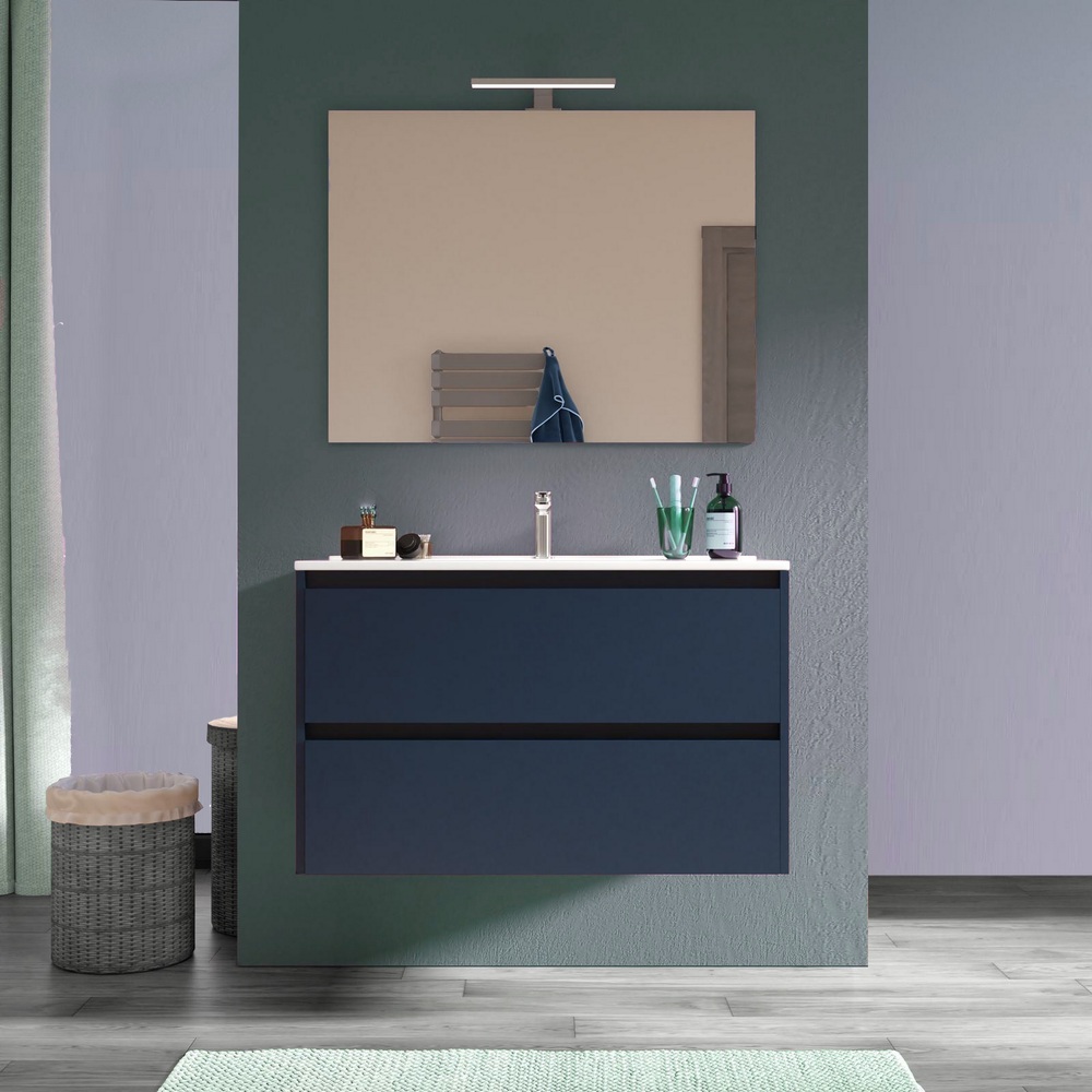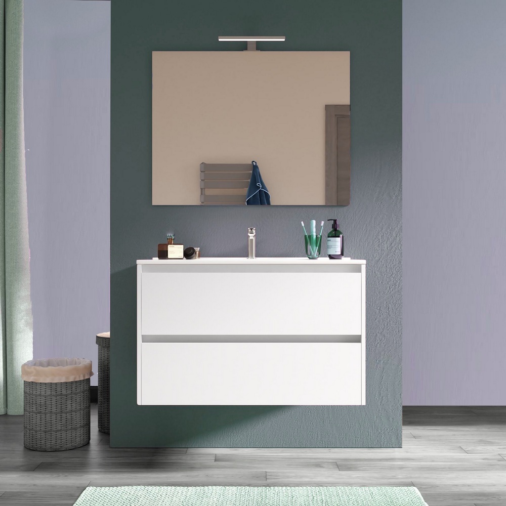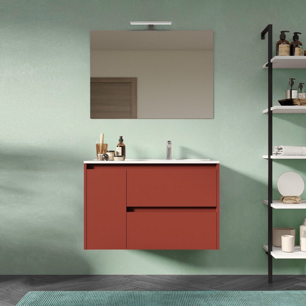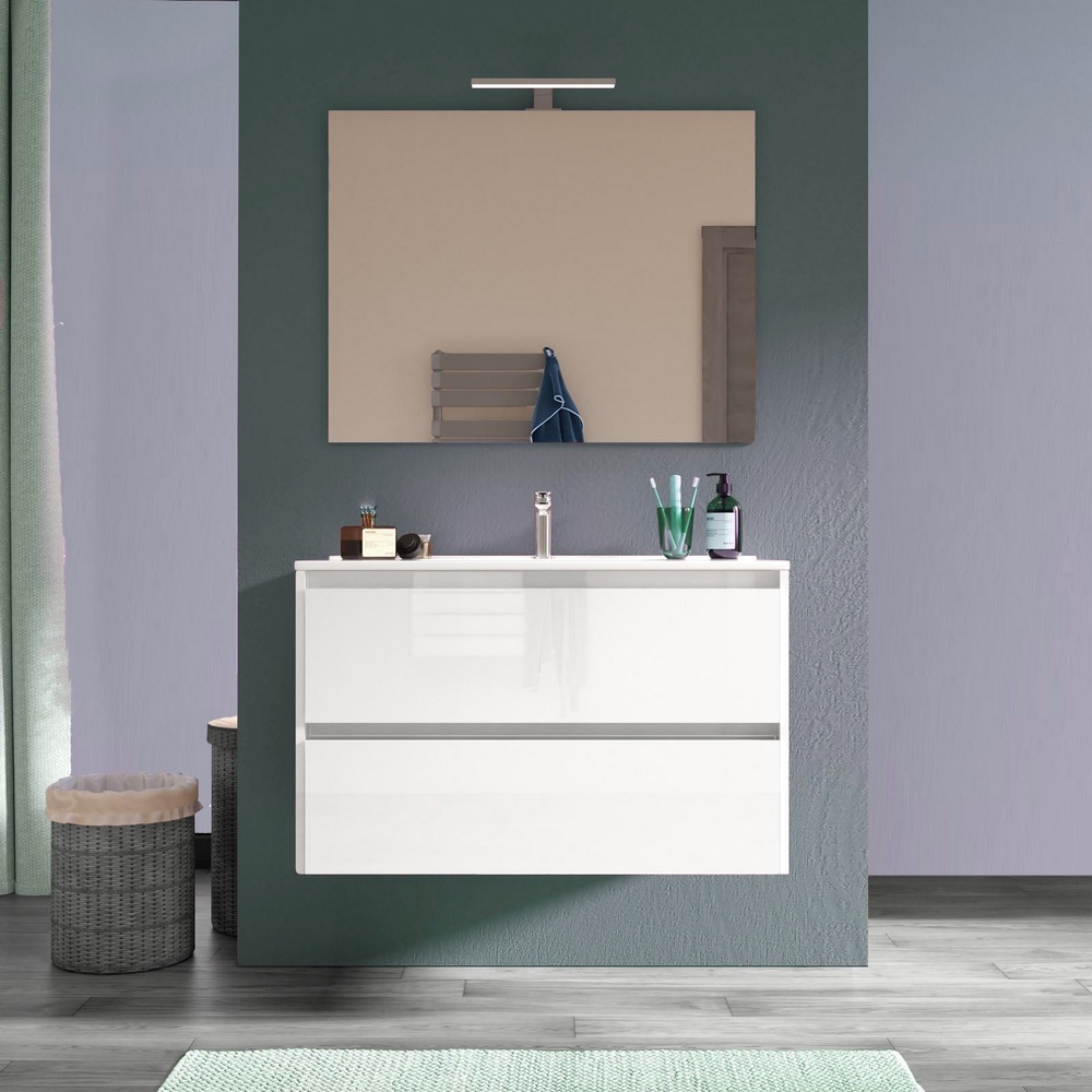 Mobile bagno moderno sospeso , disponibile da cm 90 e 100 con 2 cassetti, oppure da cm 85 con 2 cassetti ed un’anta. 9 Finiture disponibili. Specchiera e lavandino in ceramica compresi.