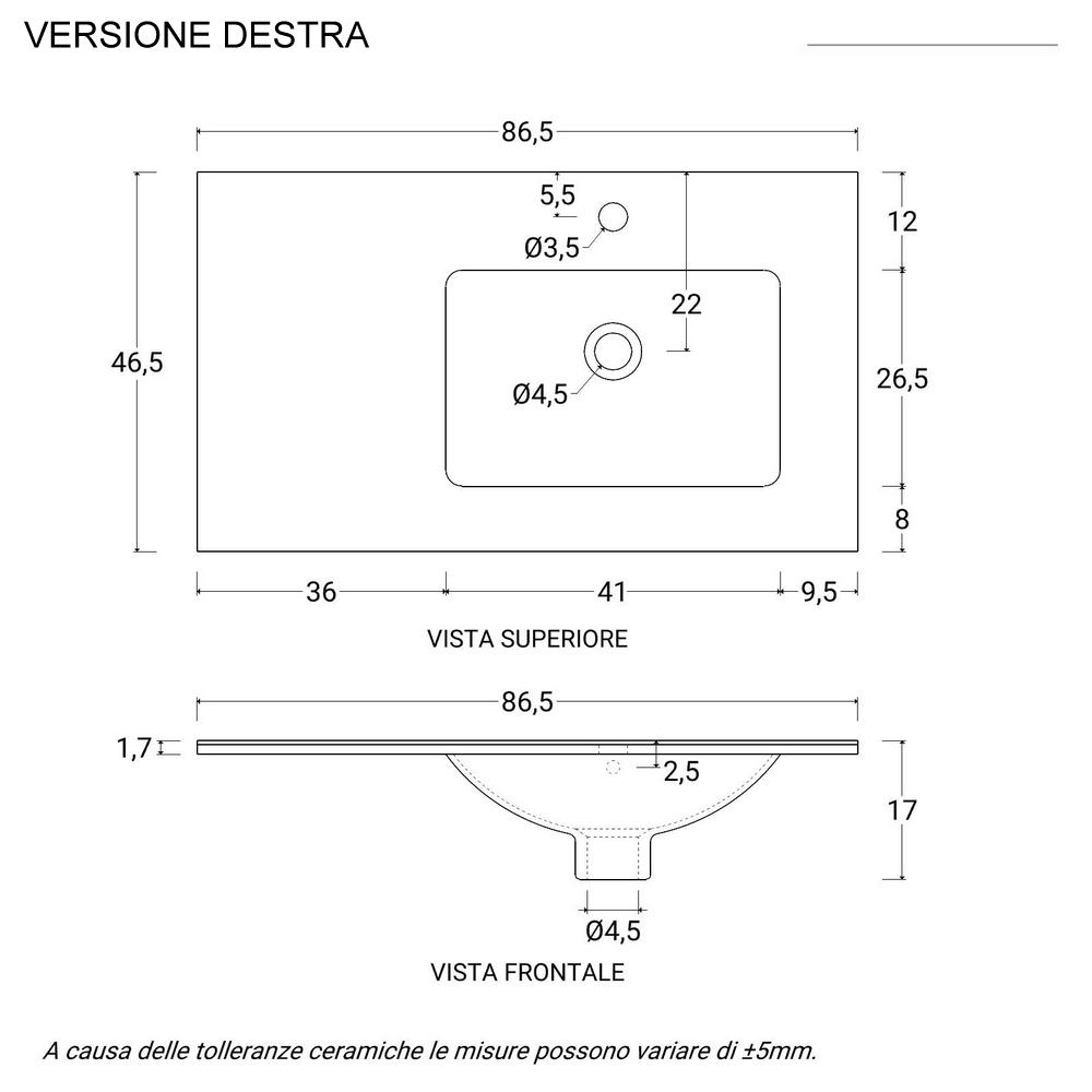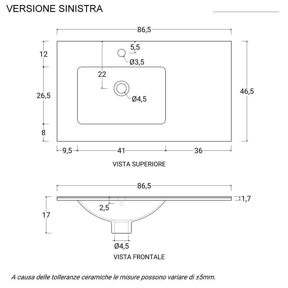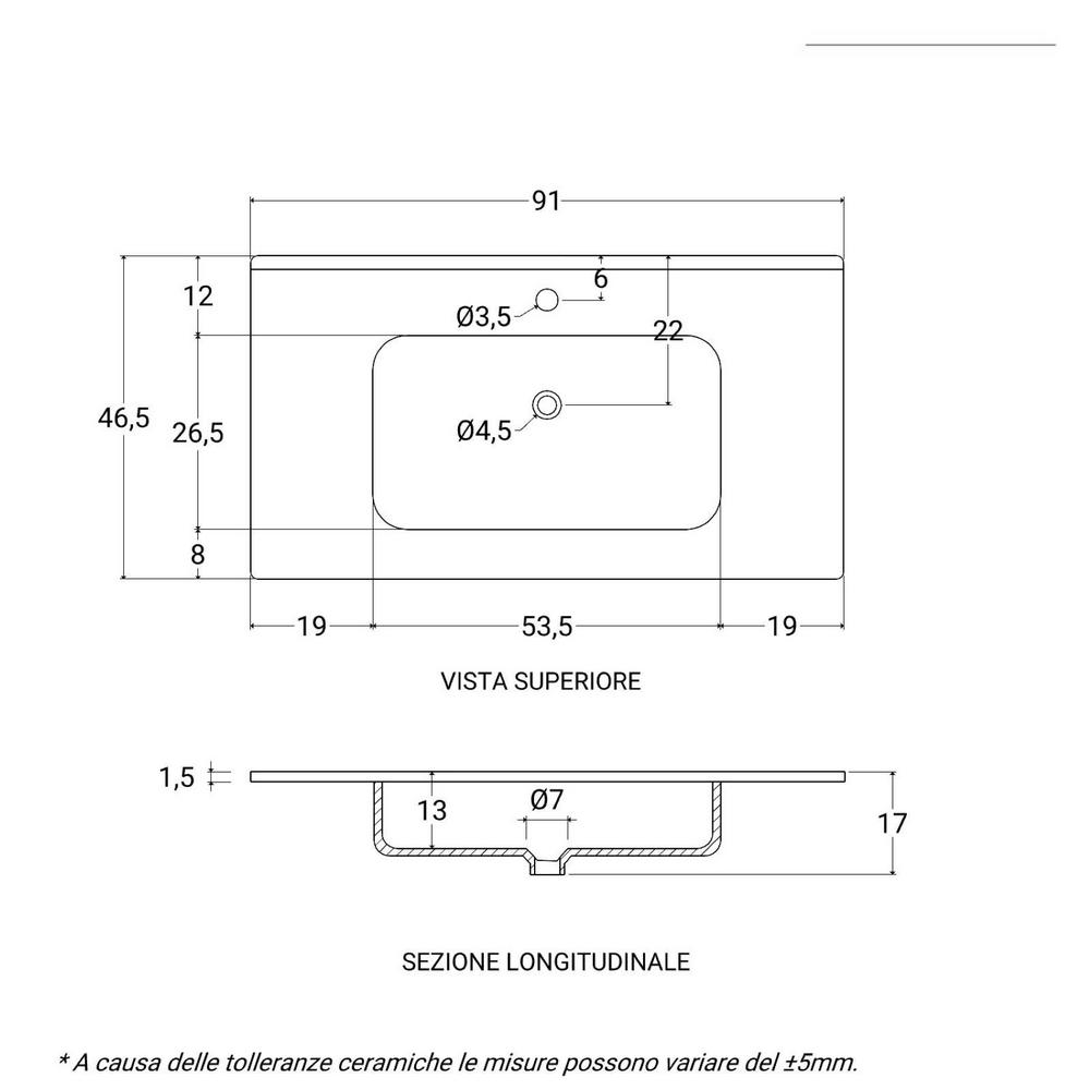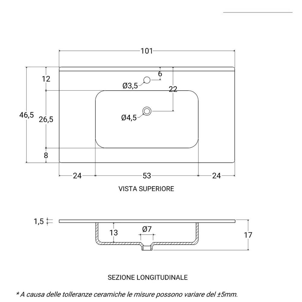 Lavandino realizzato in ceramica (da 91, 101 o 86,5 cm) con foro per rubinetteria e troppopieno