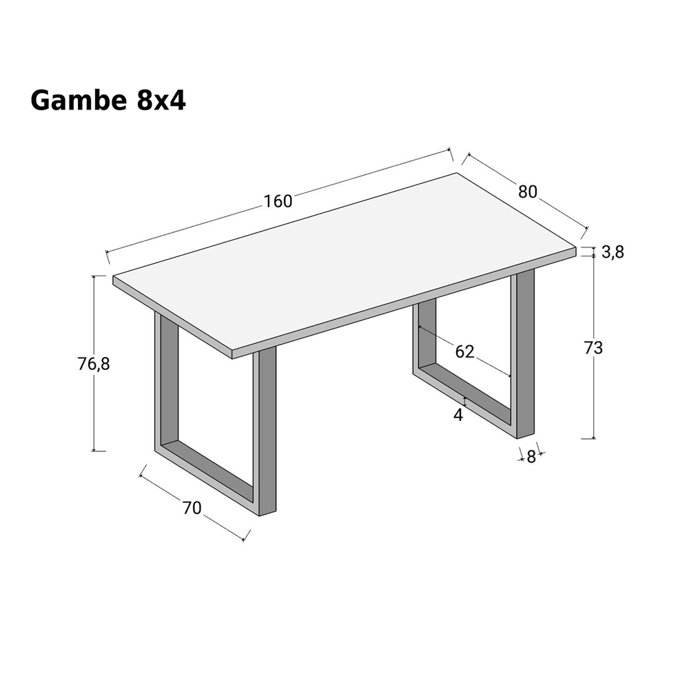 Altezza totale tavolo gambe 8×4: 76,8 cm