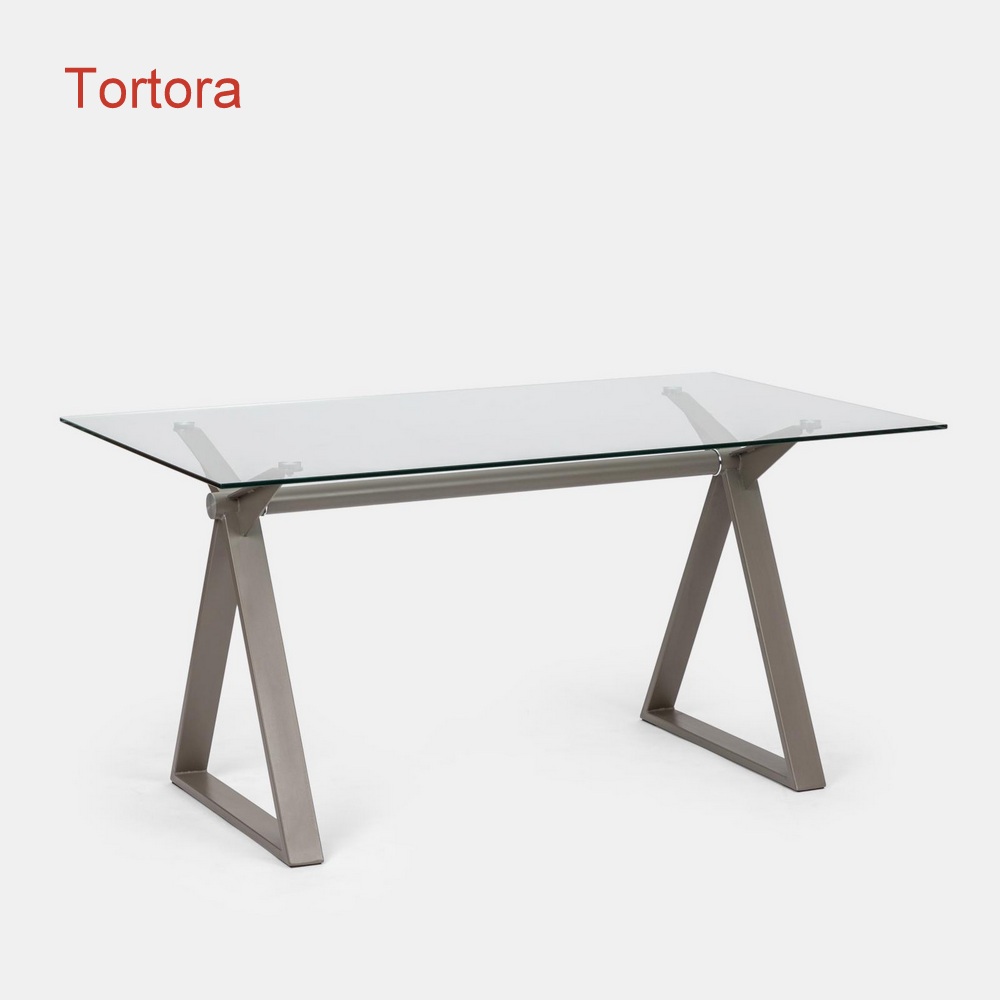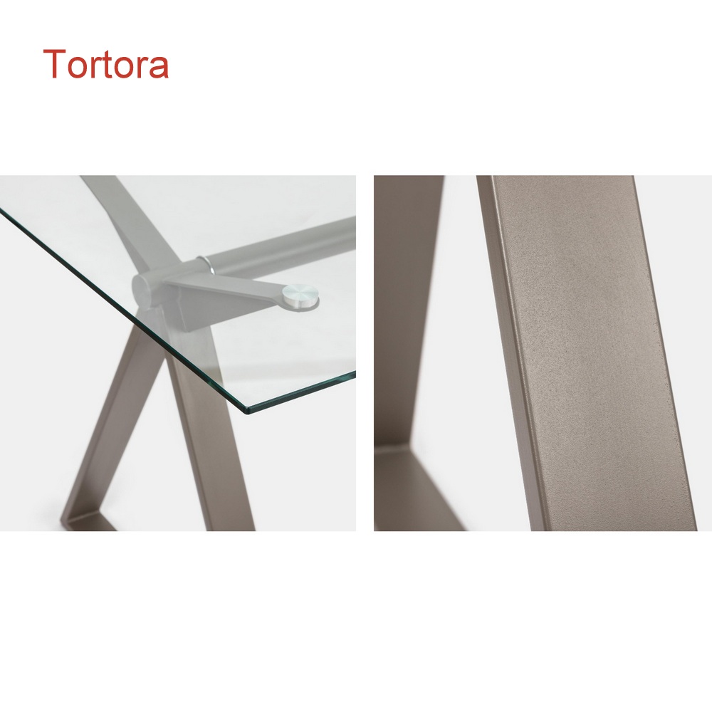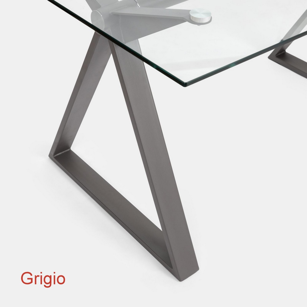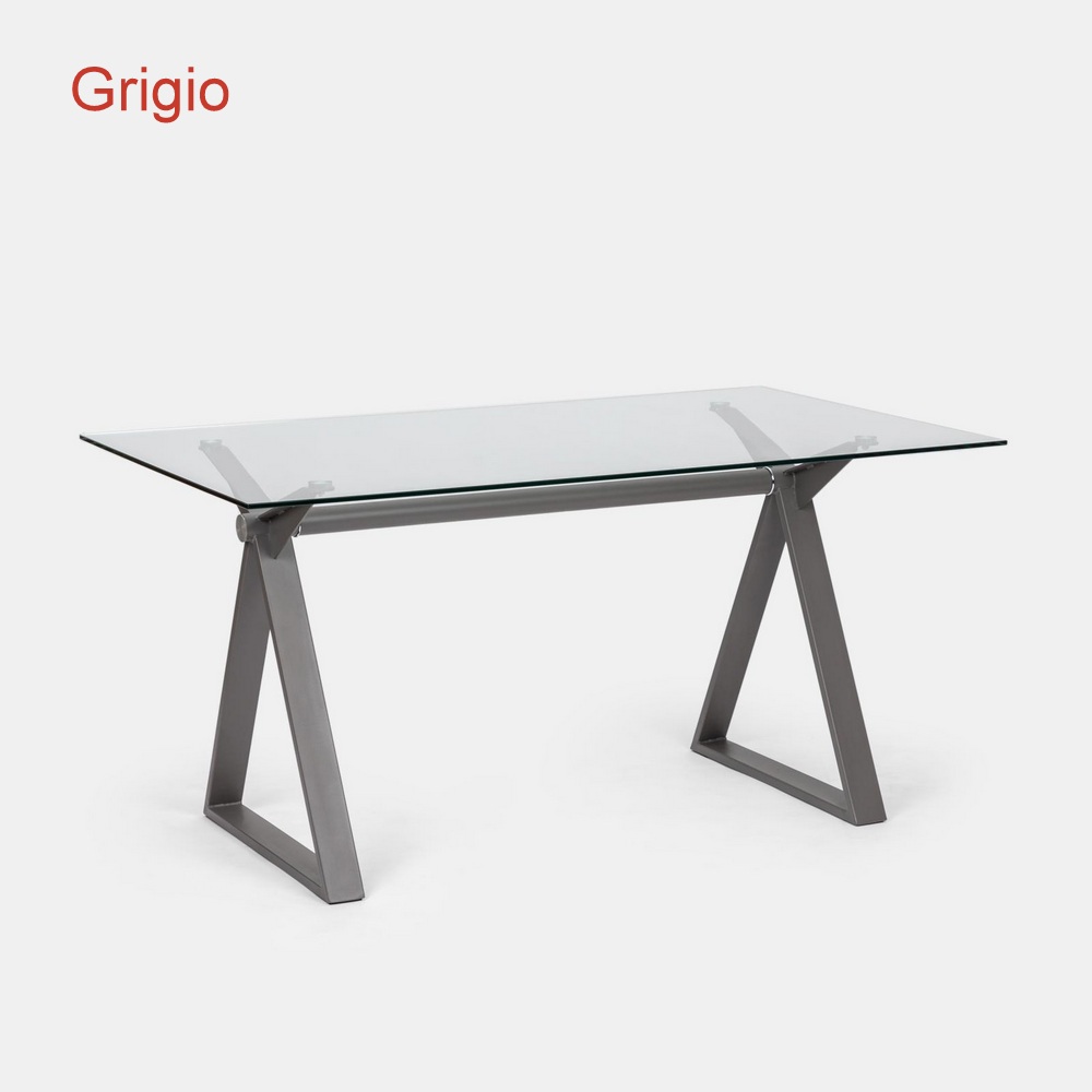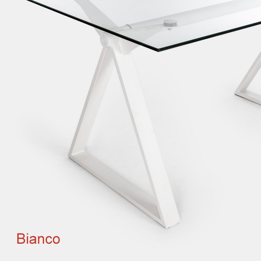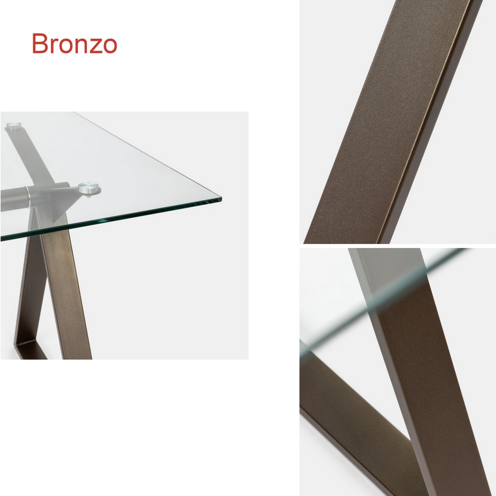 Il piano è in vetro temperato trasparente da 10mm di spessore e la strutta è inacciaio ed è disponibile nei colori bianco, grigio, nero, bronzo e tortora (Seleziona il colore dal menù a tendina)