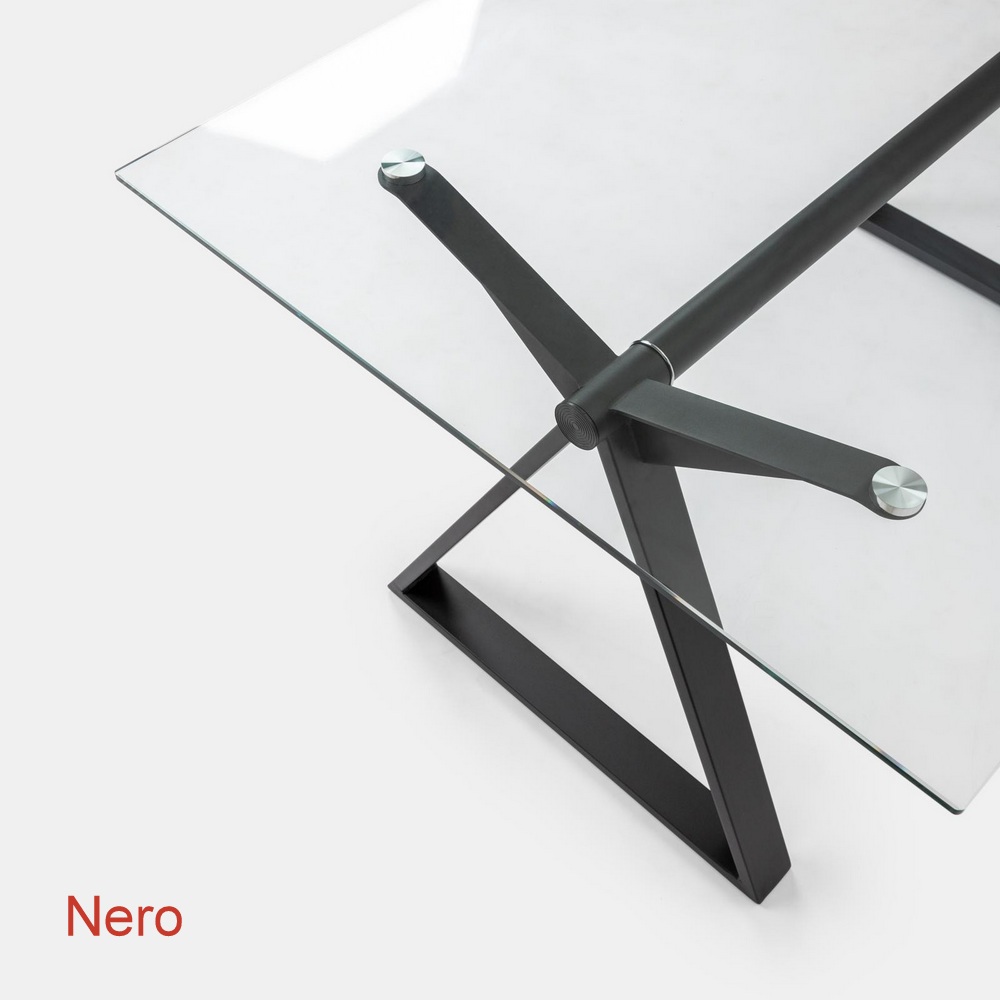Arredo da150 o 180 cm adatto sia come tavolo da pranzo che come scrivania. Le gambe in acciaio sono disponibili in 5 colori e il piano è in vetro trasparente.
