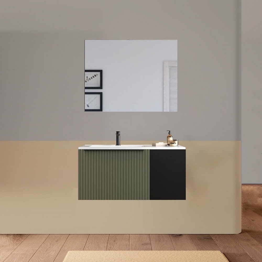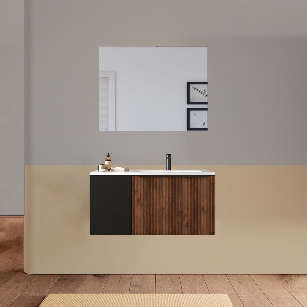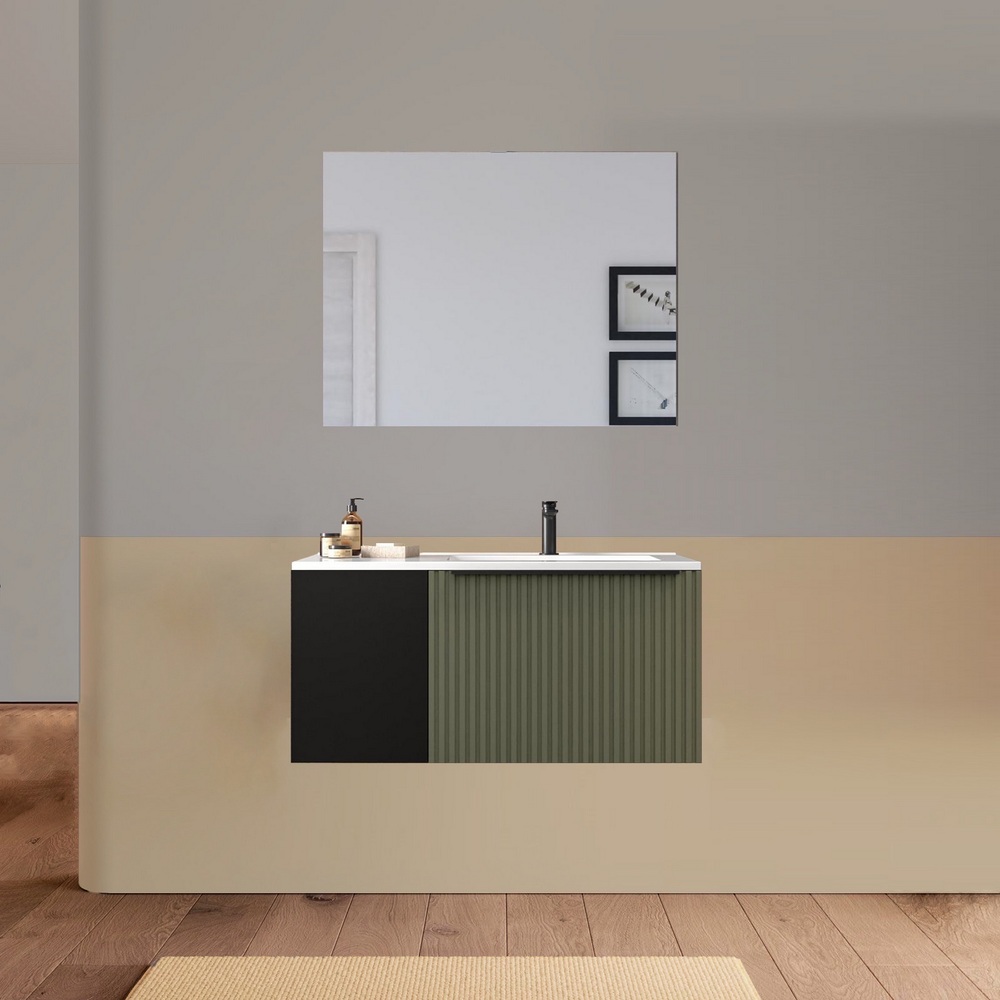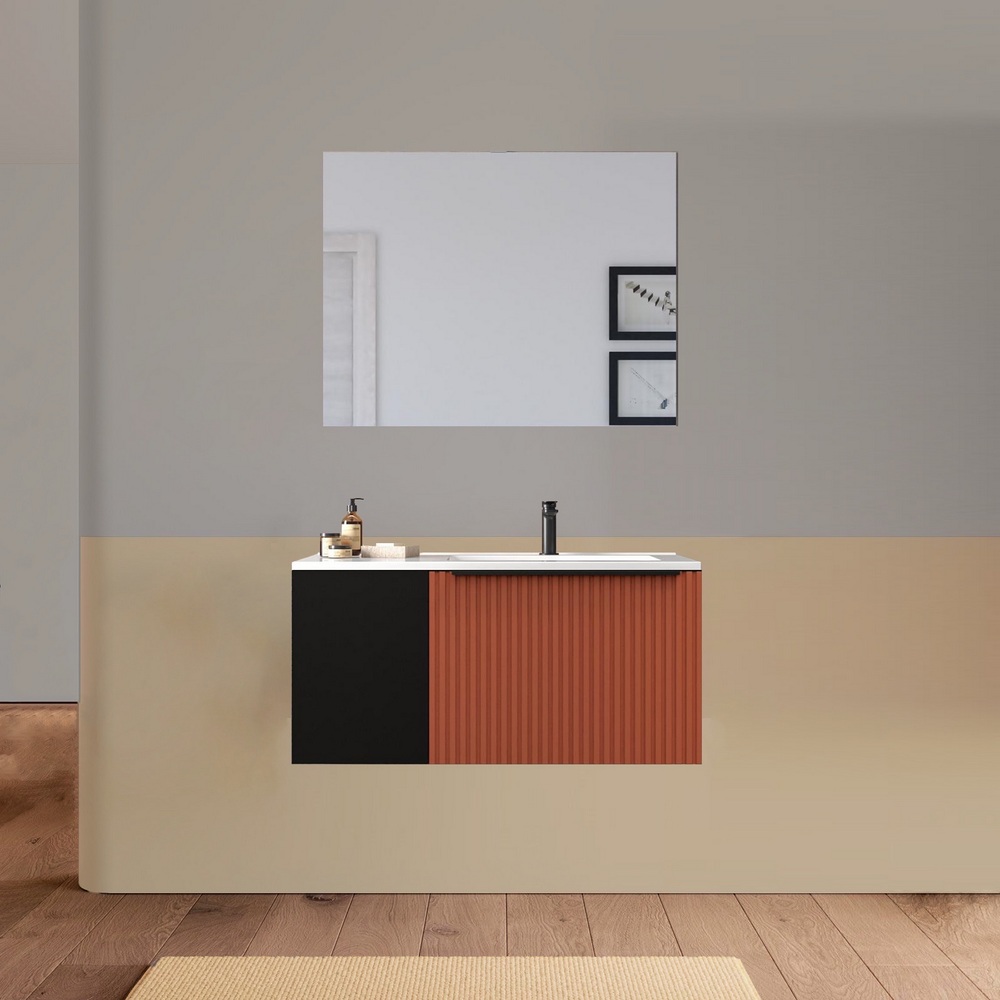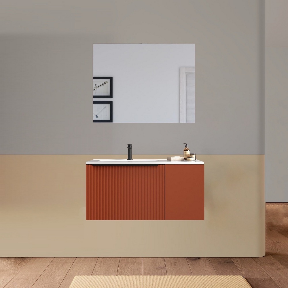 Arredo bagno sospeso da 90 o 100 cm in 11 colori. Il mobile è realizzato in mdf ed è composto da un cassettone e un’anta. La specchiera è inclusa nel prezzo.