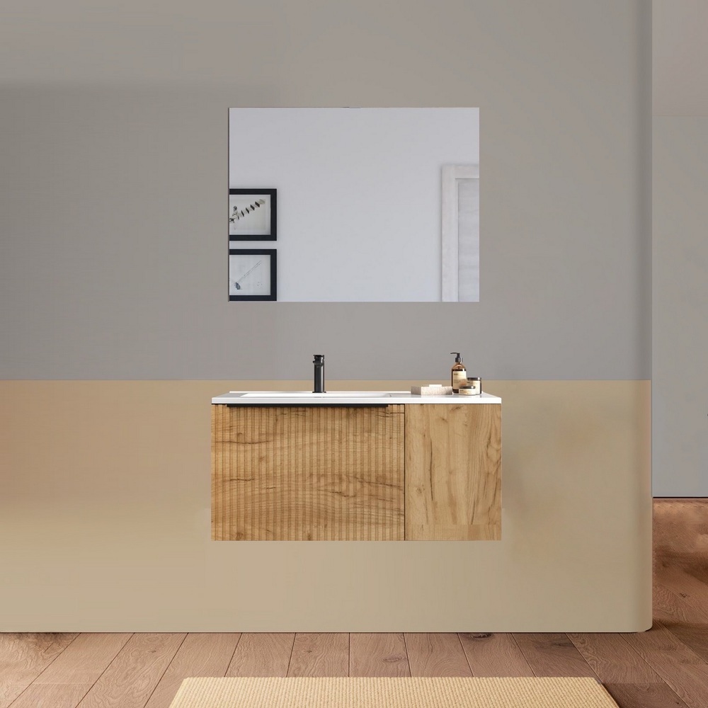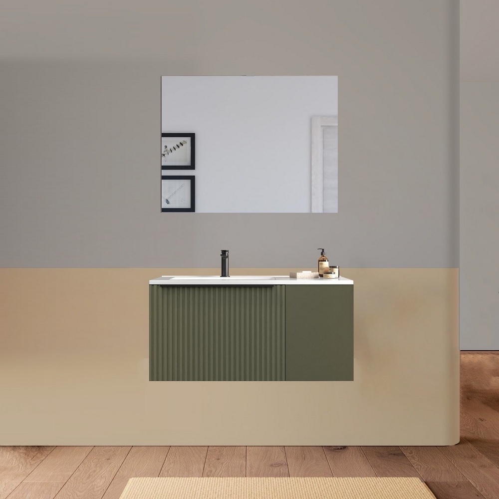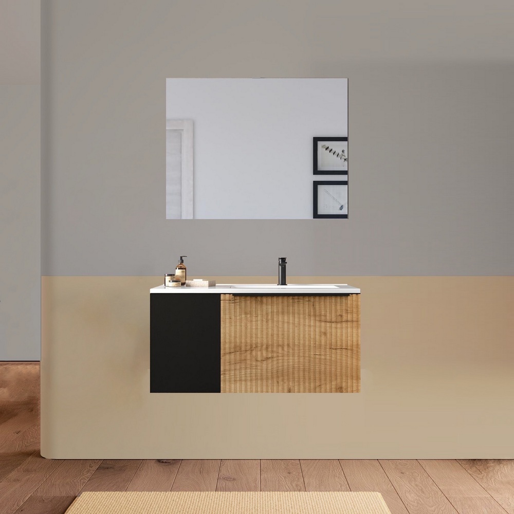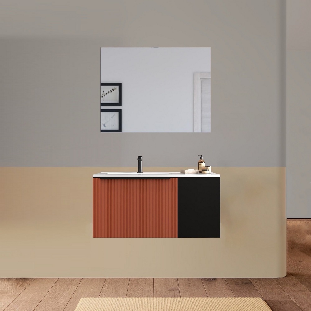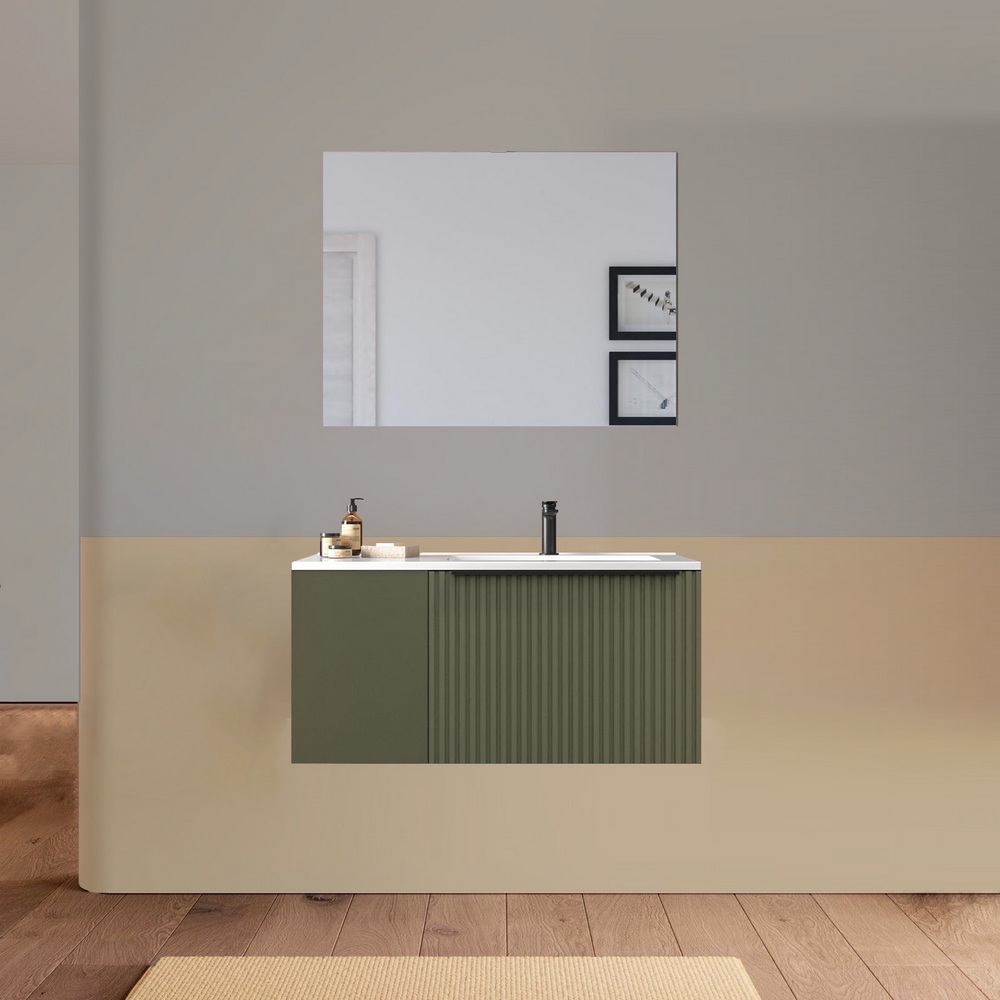 Arredo bagno sospeso da 90 o 100 cm in 11 colori. Il mobile è realizzato in mdf ed è composto da un cassettone e un’anta. La specchiera è inclusa nel prezzo.