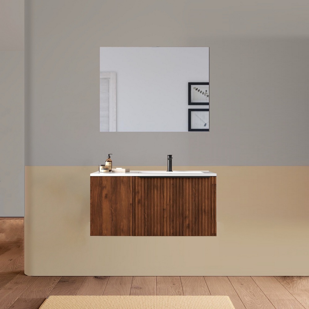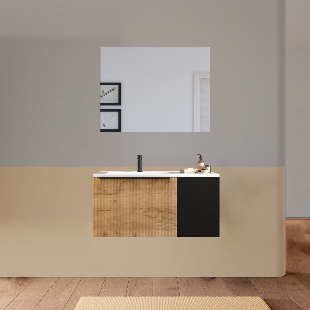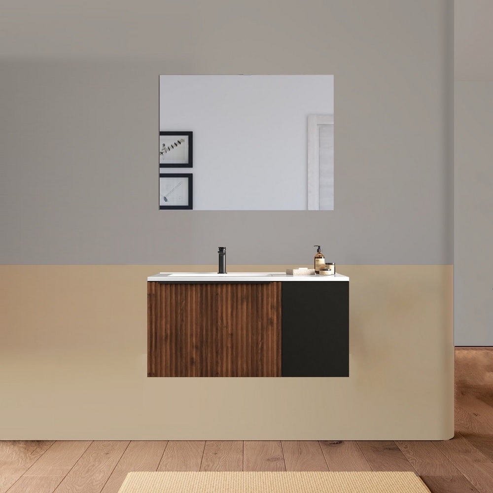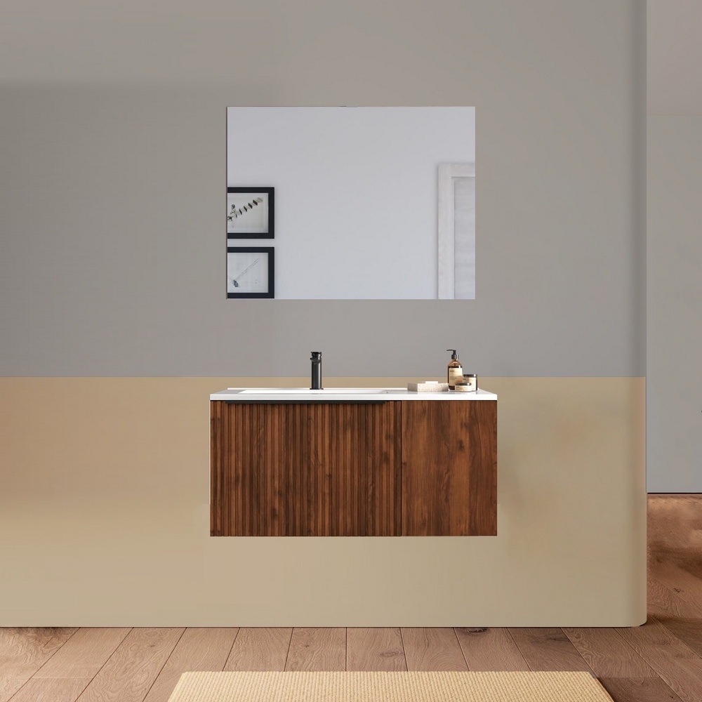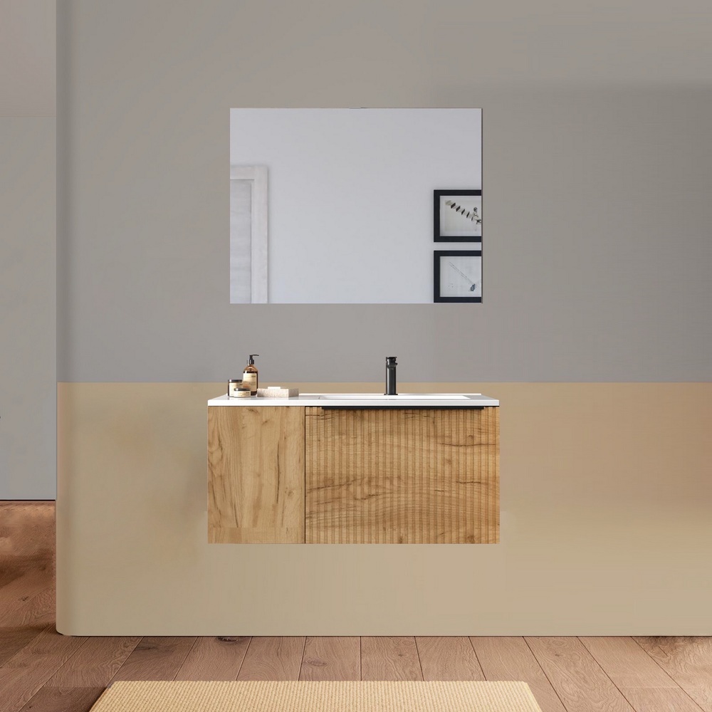 Arredo bagno sospeso da 90 o 100 cm in 11 colori. Il mobile è realizzato in mdf ed è composto da un cassettone e un’anta. La specchiera è inclusa nel prezzo.