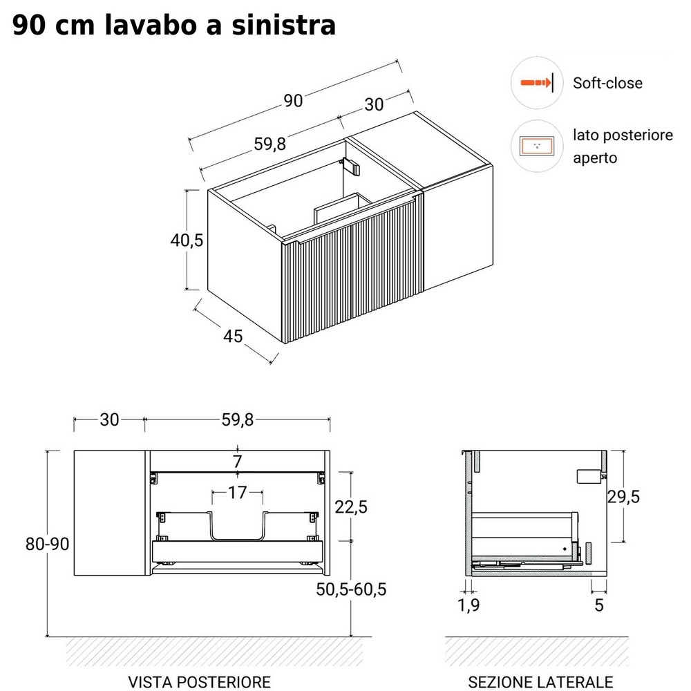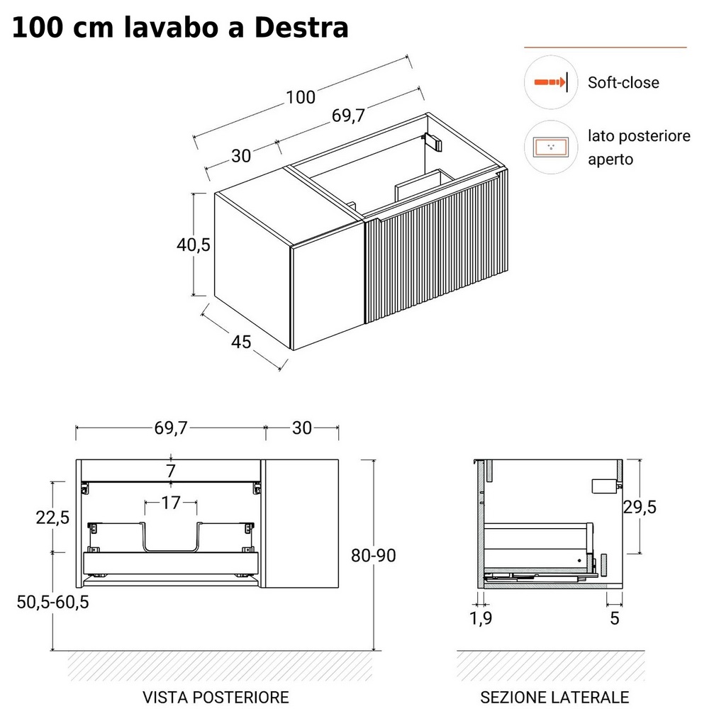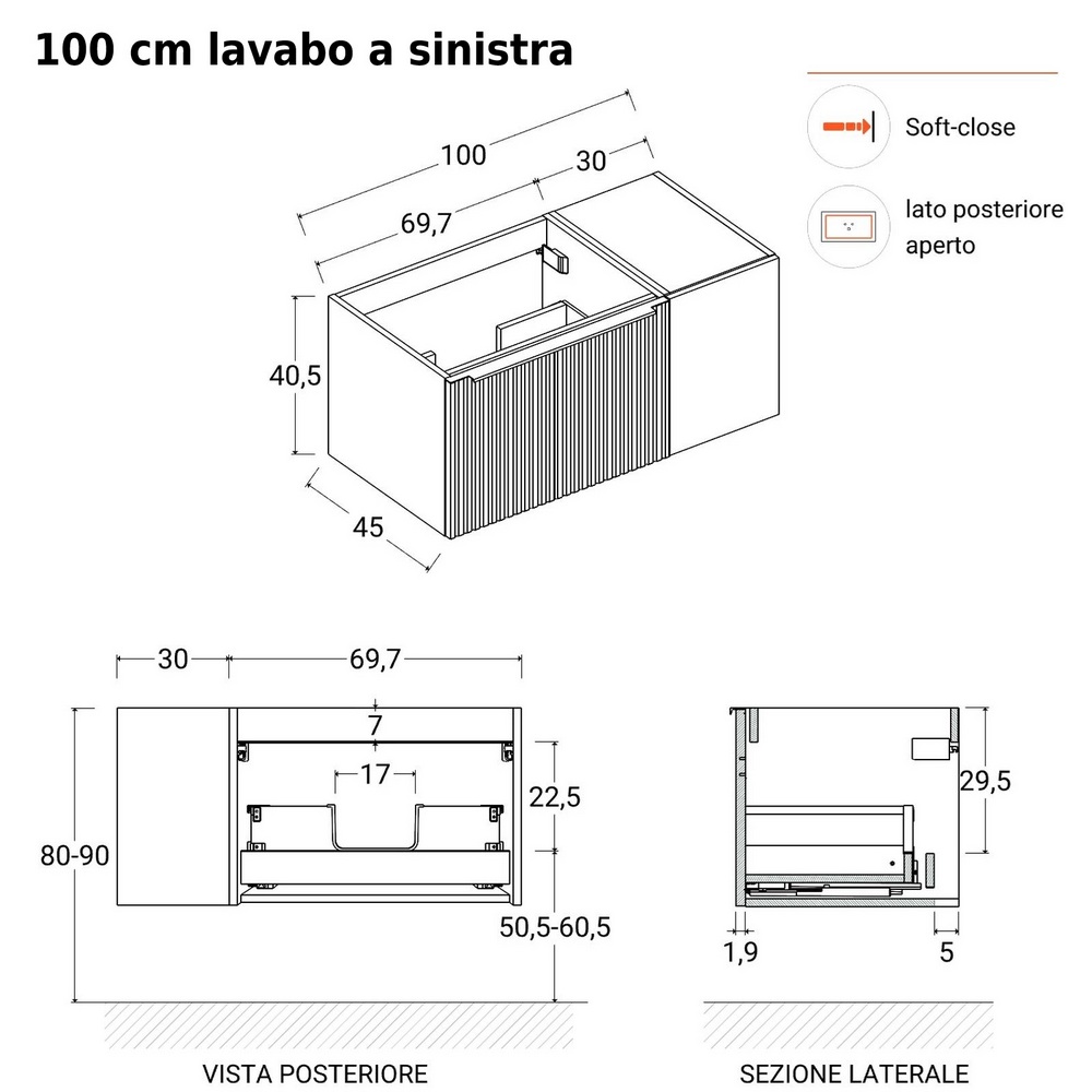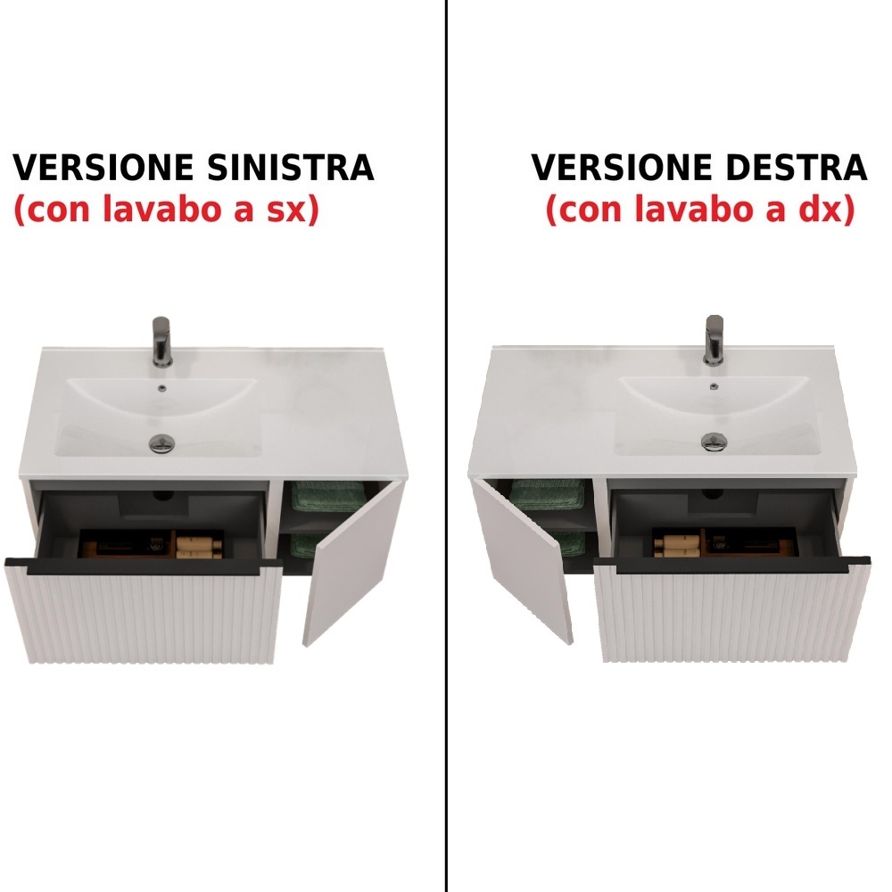 Arrerdo bagno Lion4 da 90 o 100 cm in 11 colori mobile con cassetto ed anta lavabo dx o sx