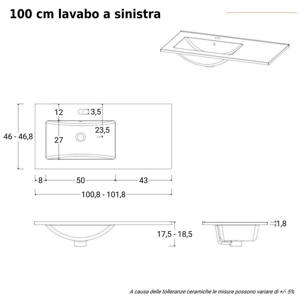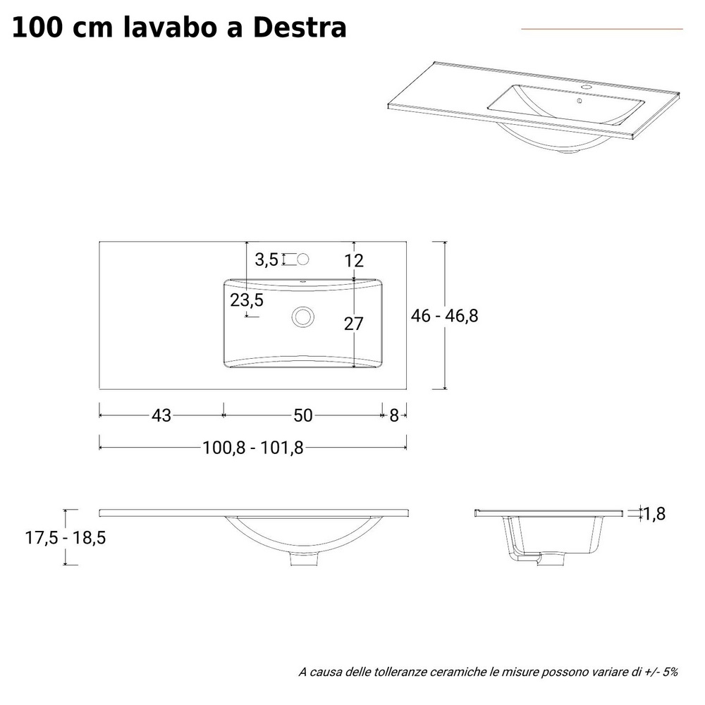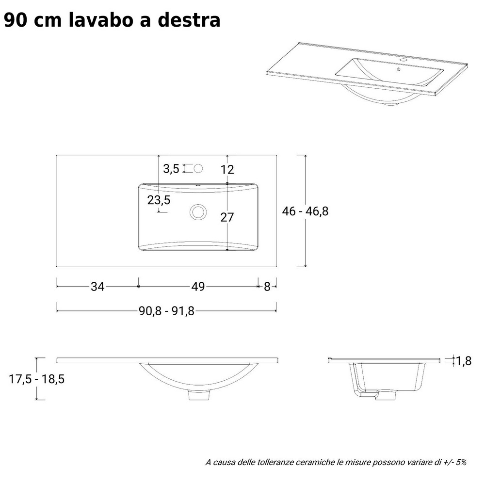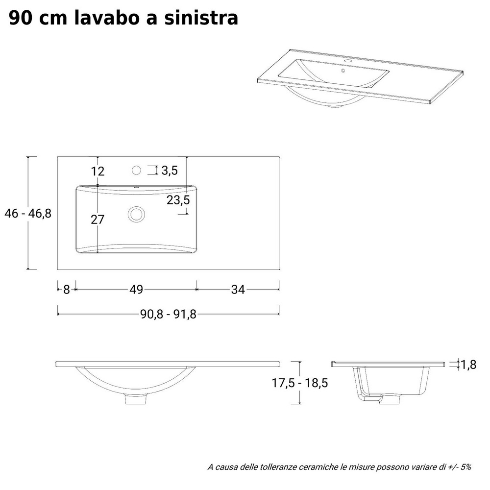Il lavabo è in ceramica bianco lucido e può essere o con vasca decentrata A DESTRA oppure A SINISTRA (sopra il cassettone)