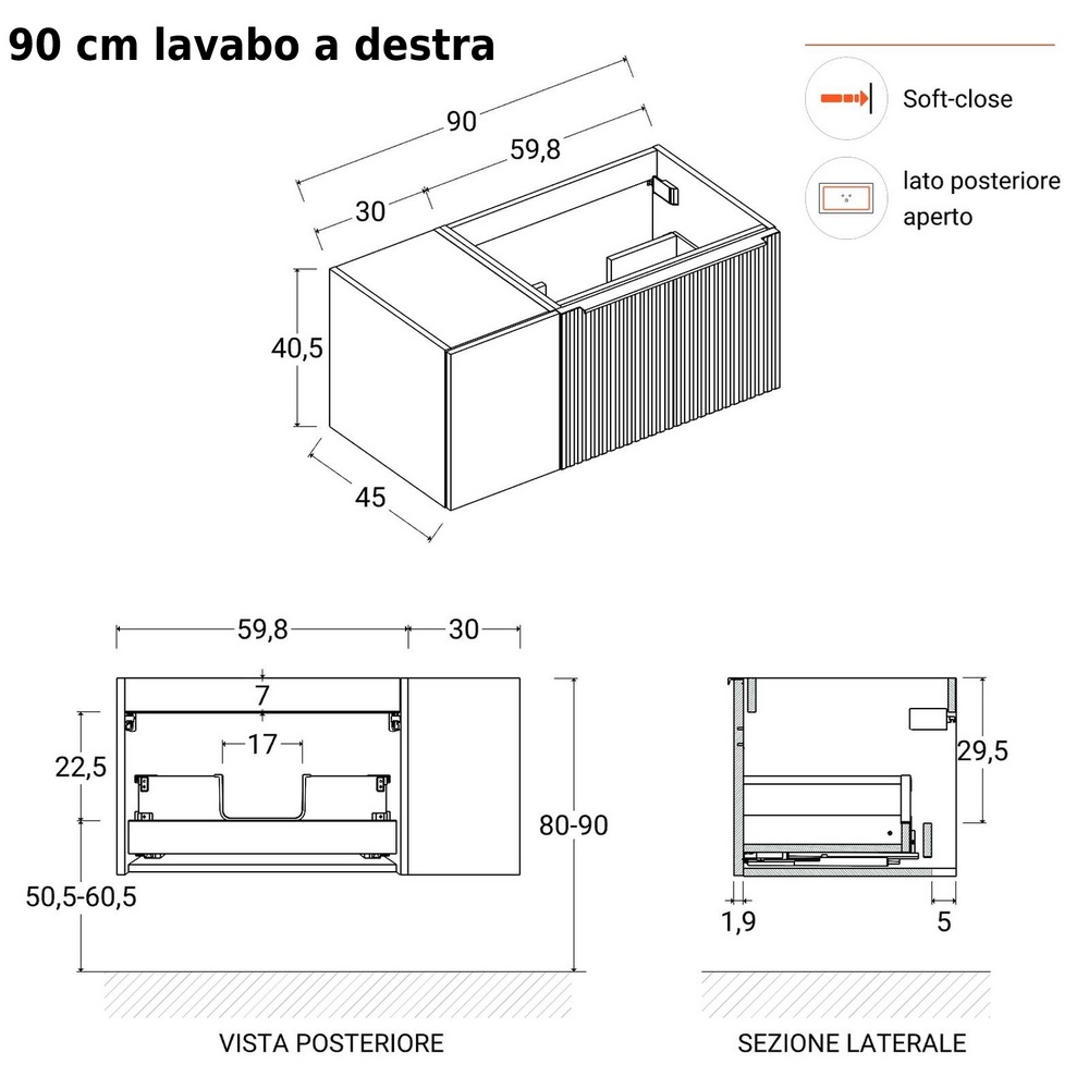 Arredo bagno ad installazione sospesa composto da un cassettone ed un anta a chiusura softclose