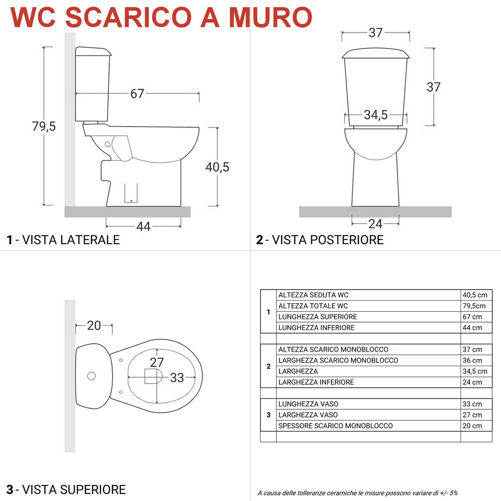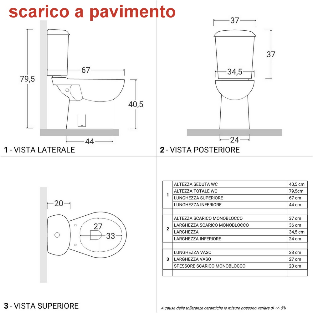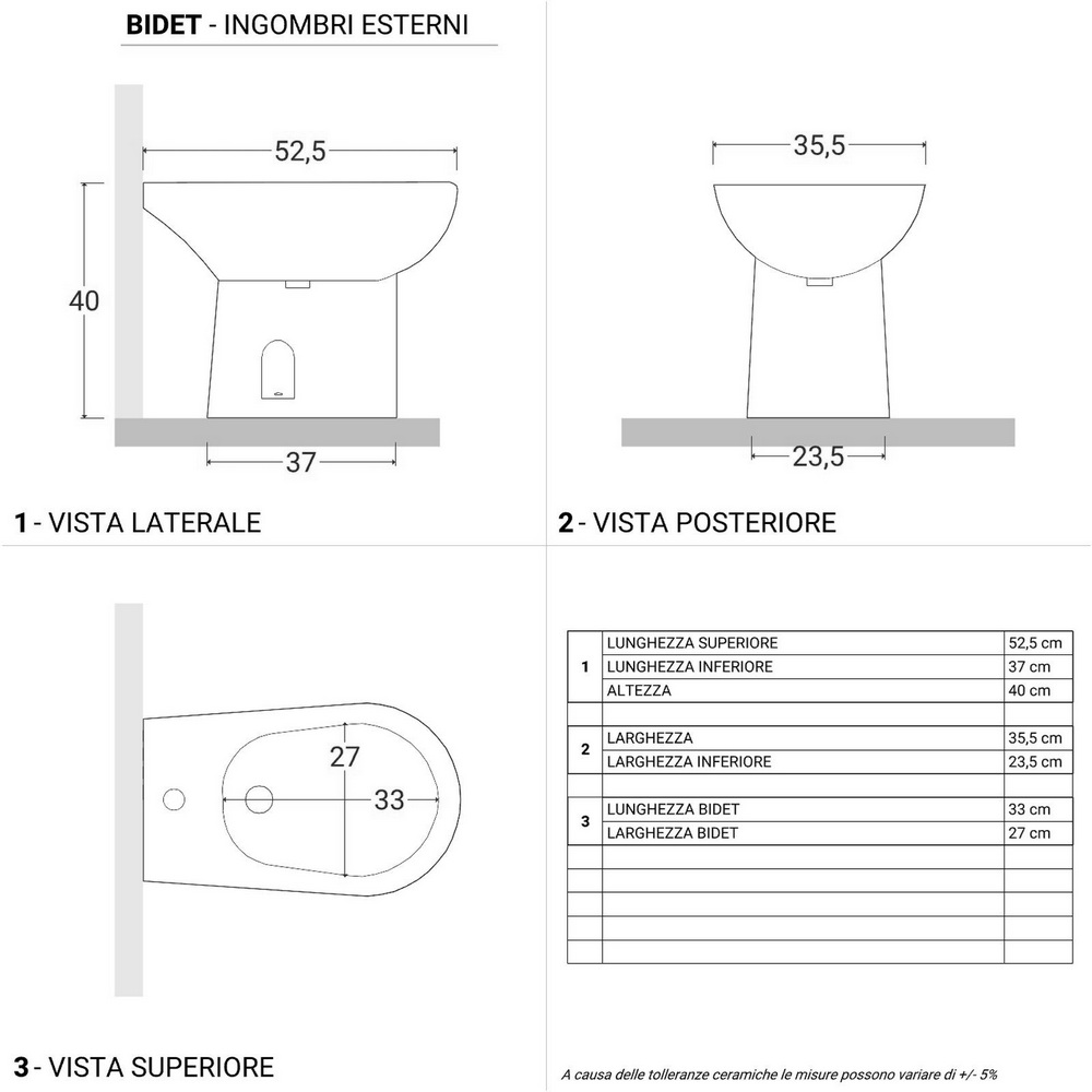 Le misure del bidet sono 35,5xP52,5xH40 cm e del wc 34,5xP67 cm (altezza totale 79,5 cm; altezza seduta 40,5 cm)