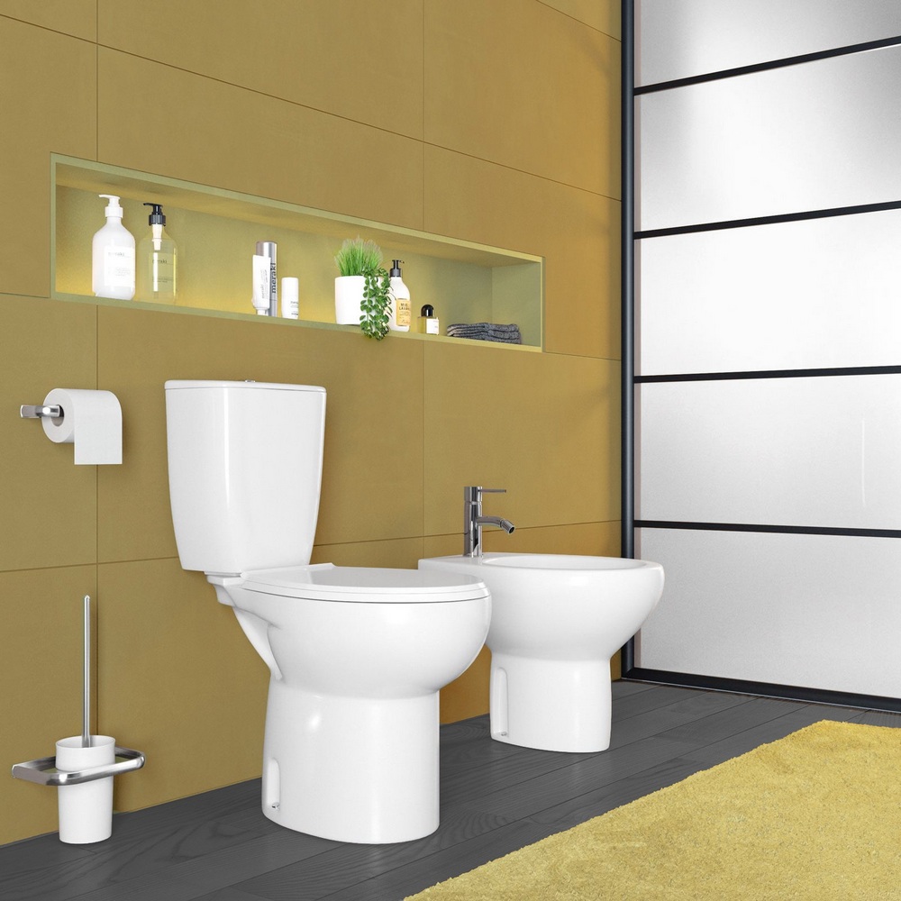 Sanitari con scarico a terra o a muro. Wc monoblocco e bidet realizzati in ceramica bianco lucido. Copriwc softclose incluso.