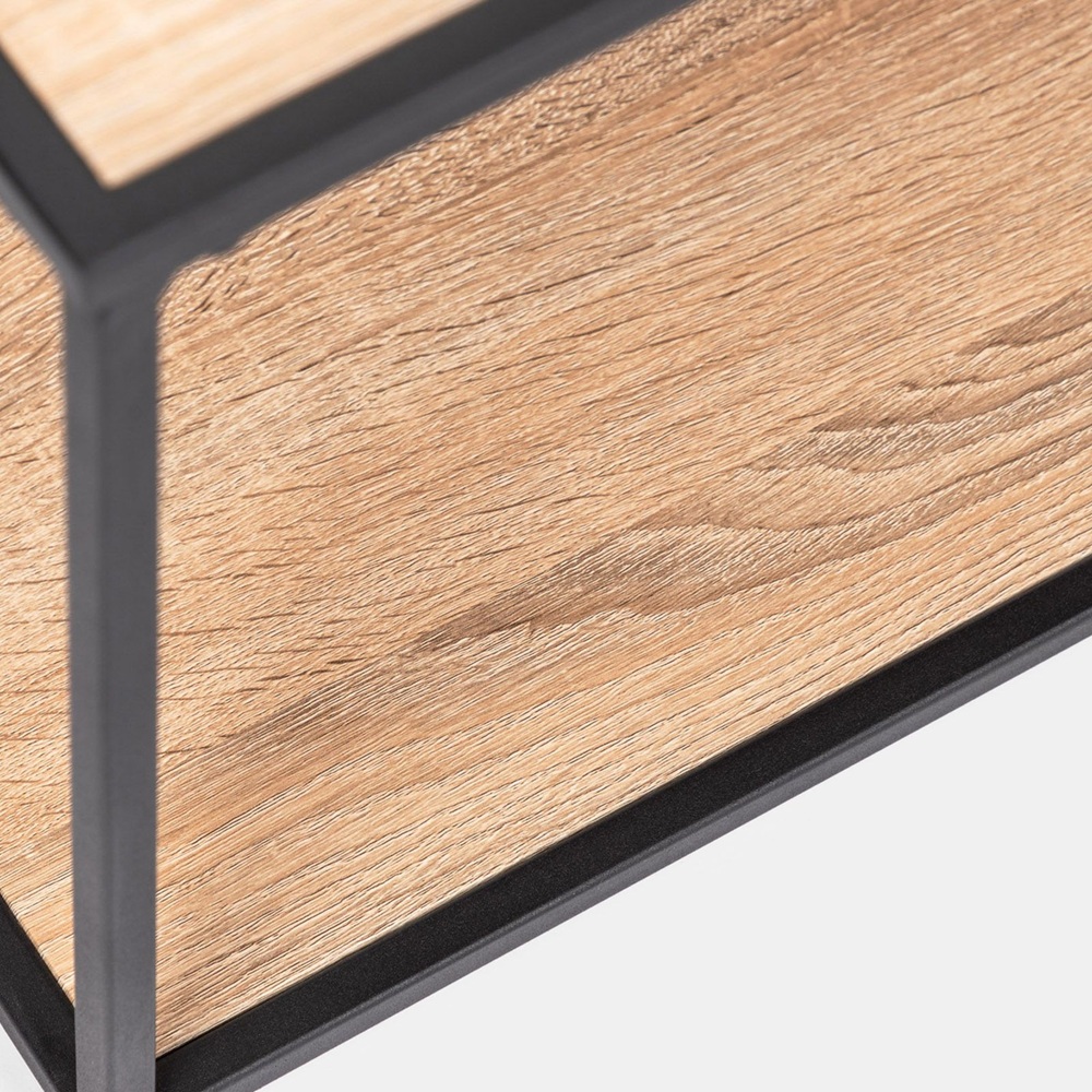 La struttura è realizzata in metallo verniciato colore nero e i ripiani in legno MDF effetto rovere